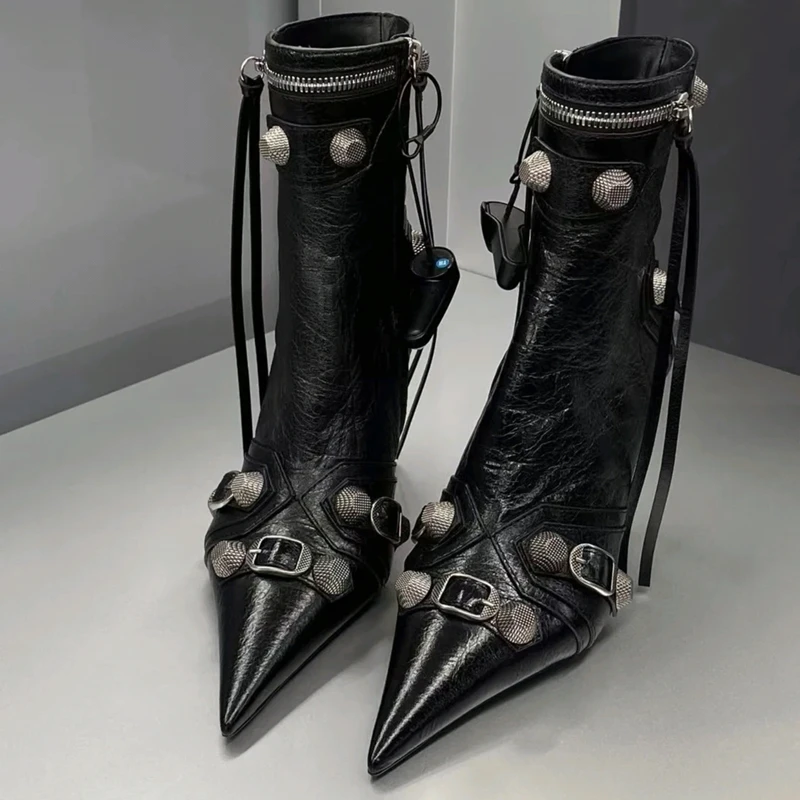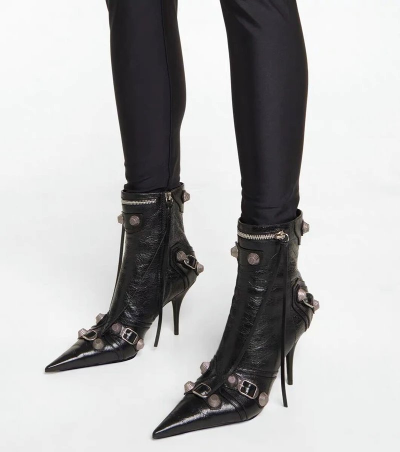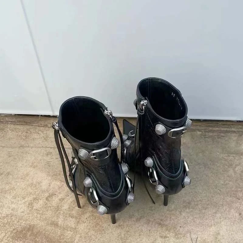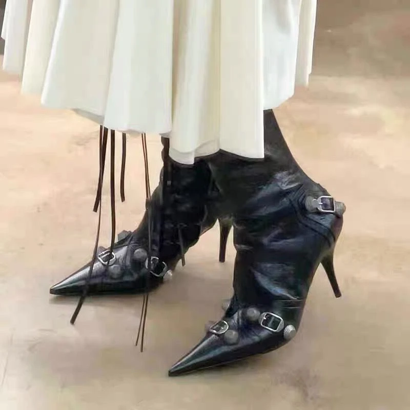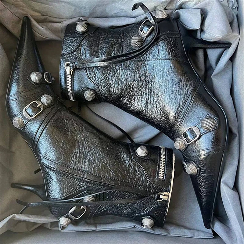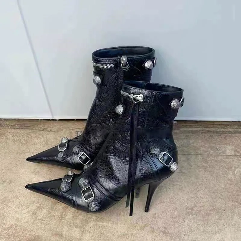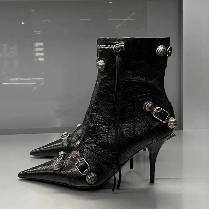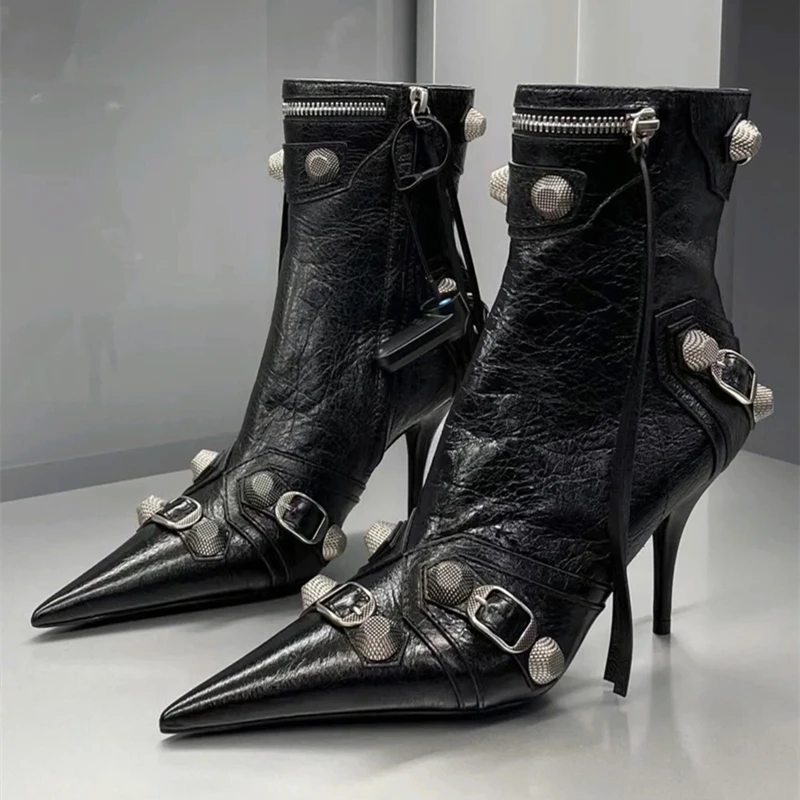 flowersverse New Women Slim High Heel Metal Buckle Chain Luxury Shoes Fashion Comfortable Pointed Toe Ankle Boots Stiletto Party Short Boots