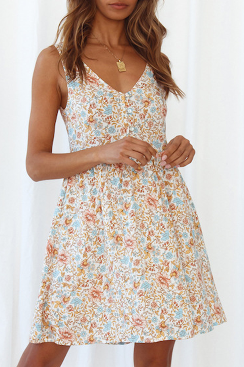 flowersverse Casual Floral Buckle V Neck A Line Dresses