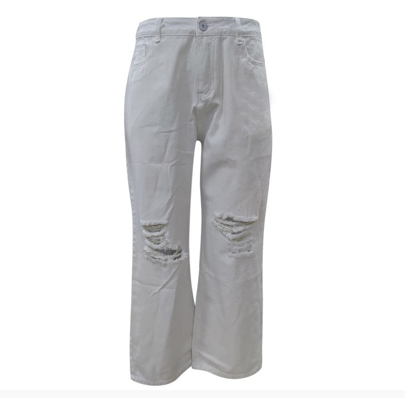Popular trade solid color ripped loose jeans women
