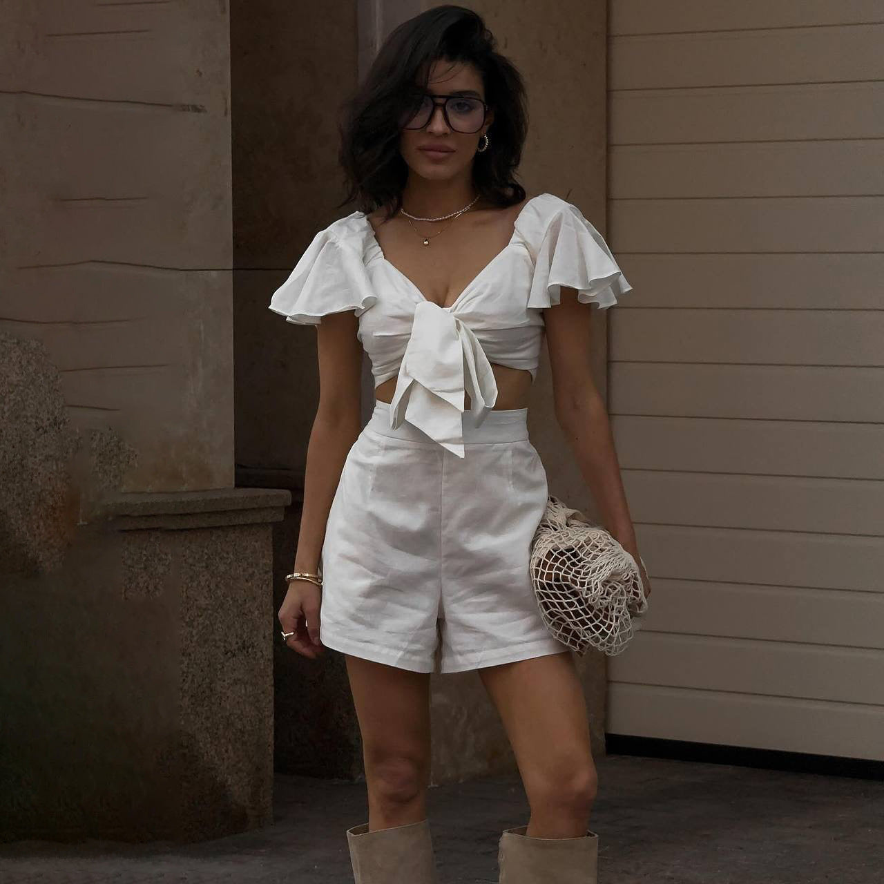 Popularan beautiful women's fashion v-neck waist flying sleeves bow top high waist shorts set niche fresh casual