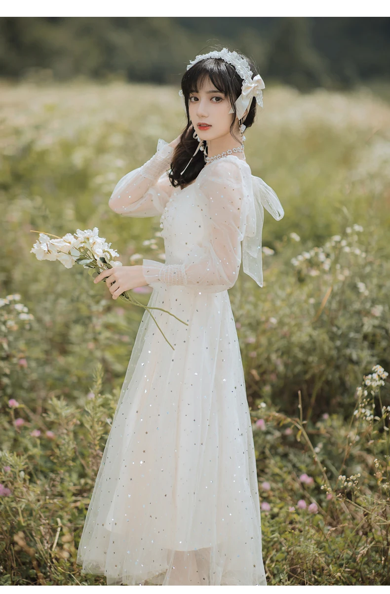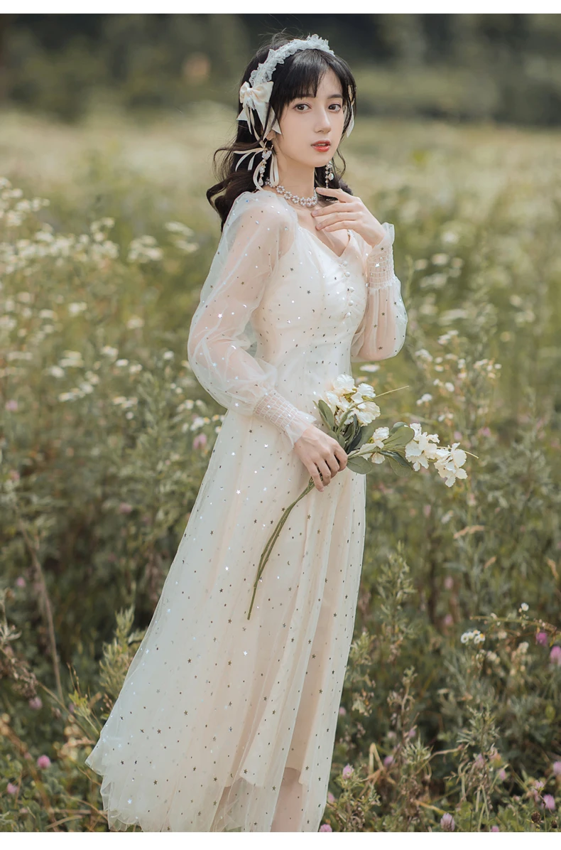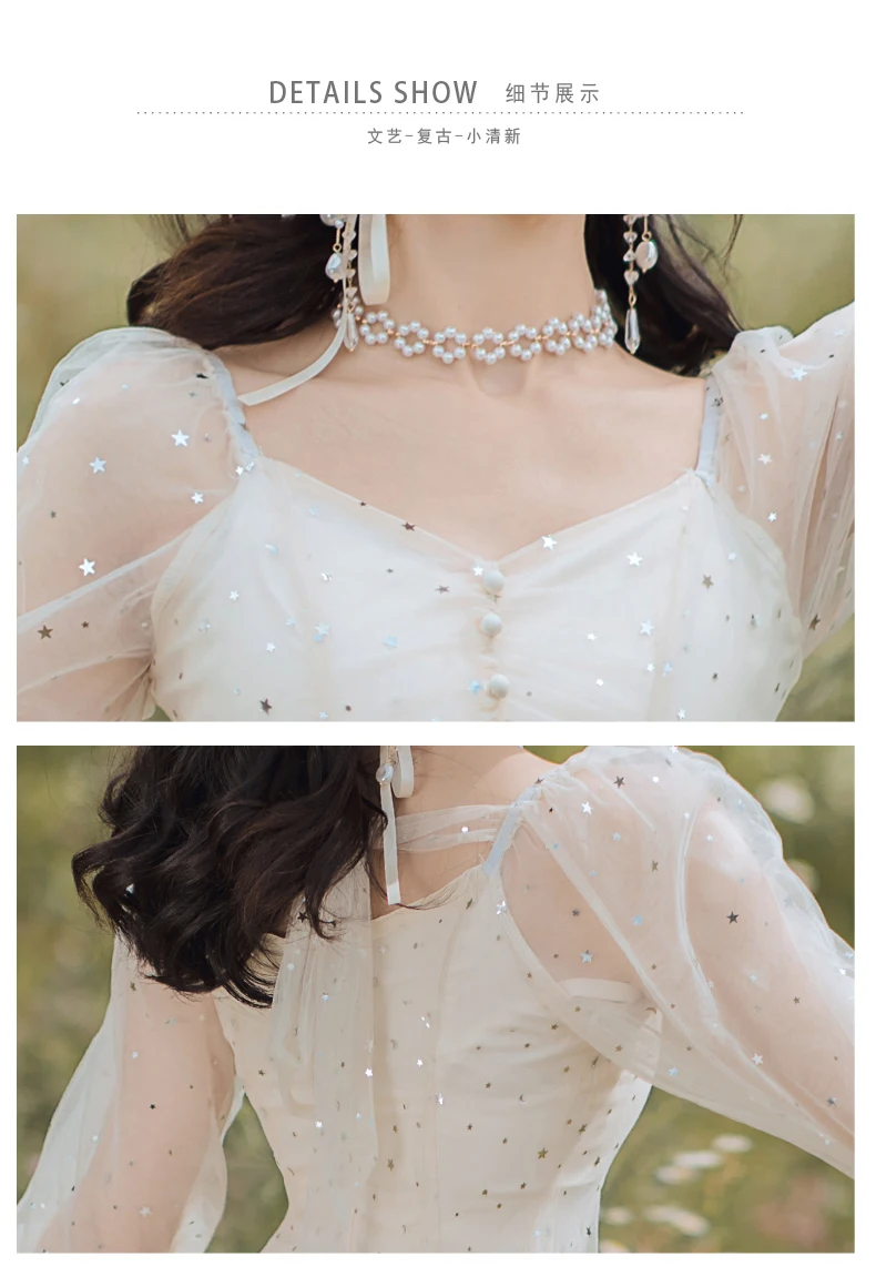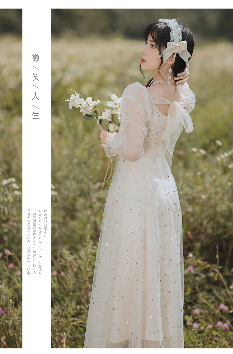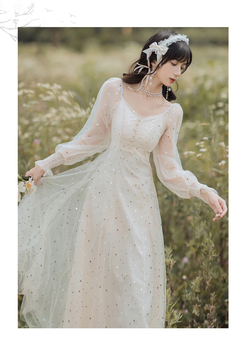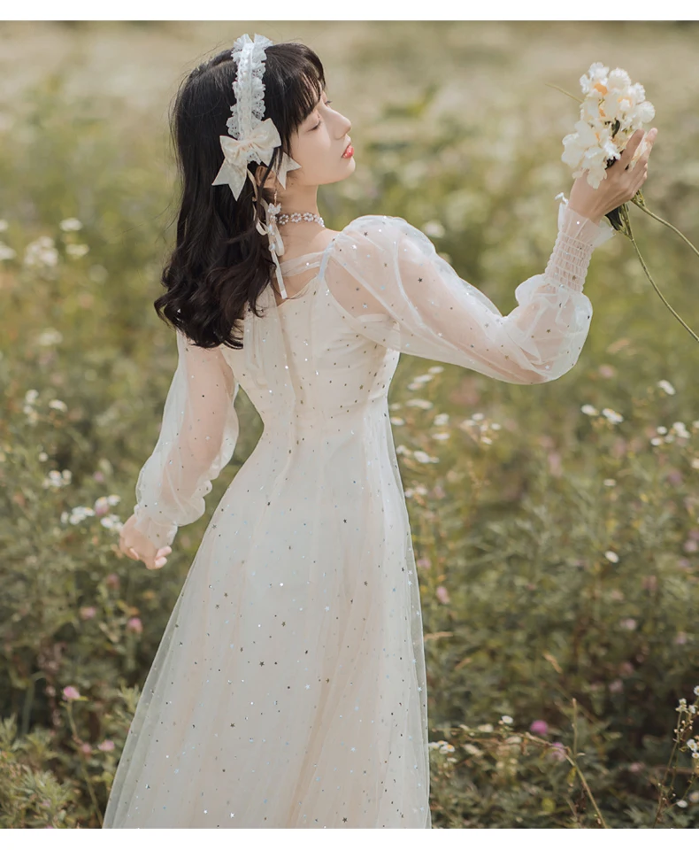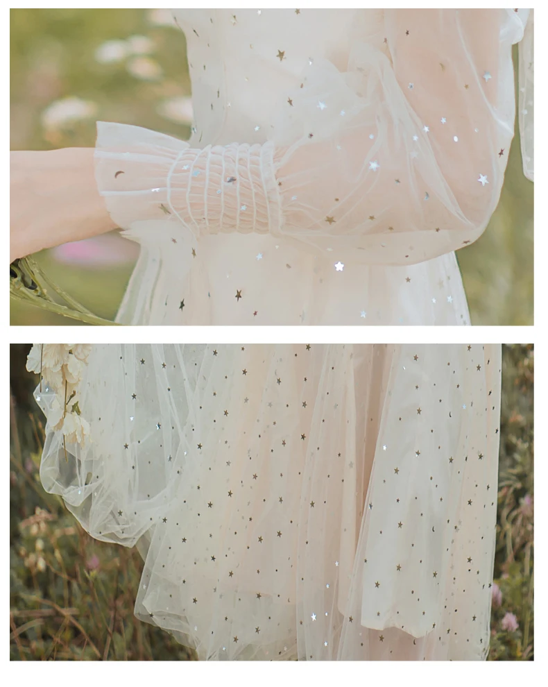 flowersverse Back to school Romantic Mesh Lace Fairy Dress Women Vintage Star Sequins Lantern Sleeve Soft Elegant Lady Midi Dresses Vestido Festa Ropa Mujer