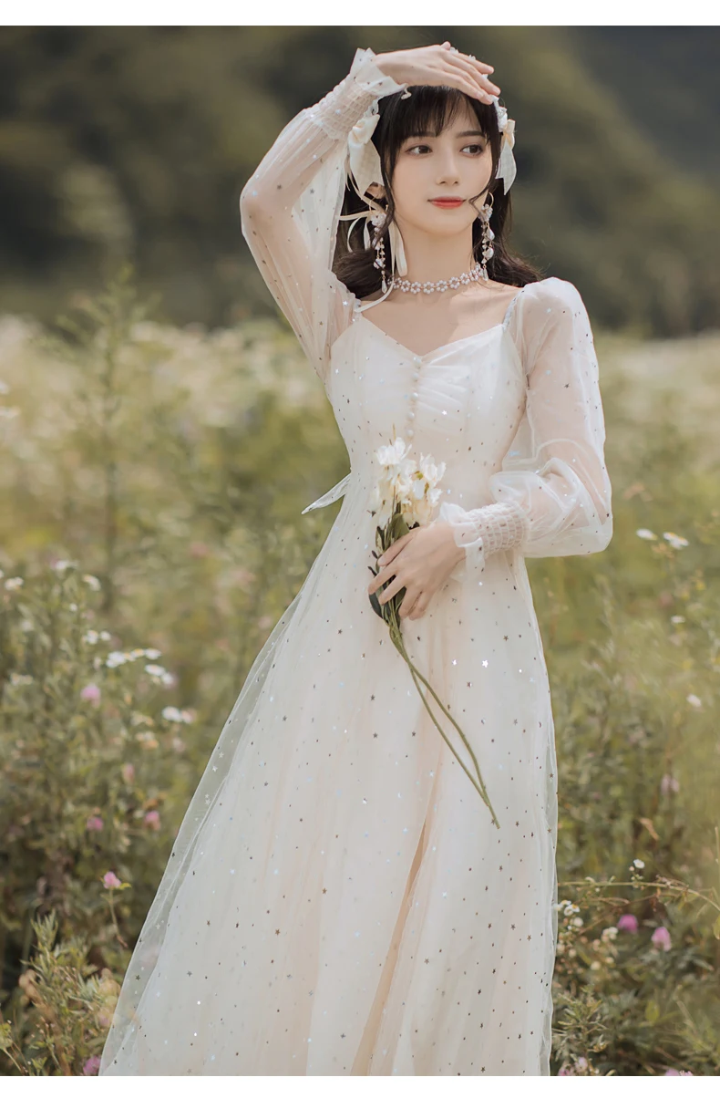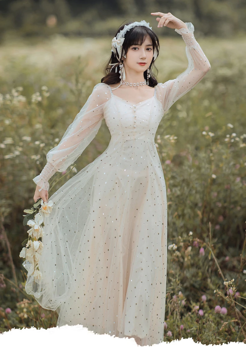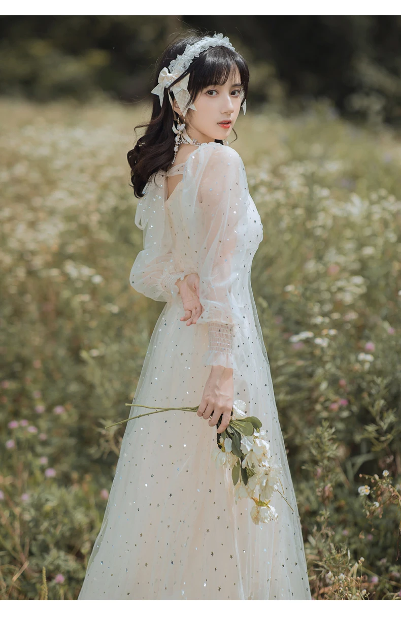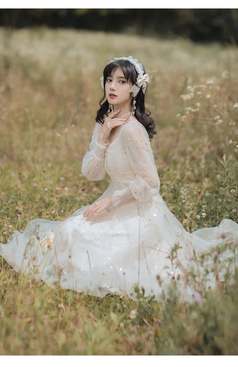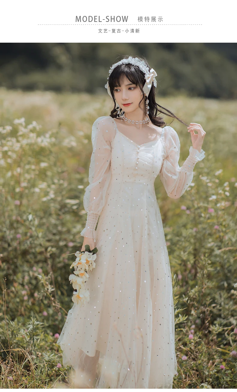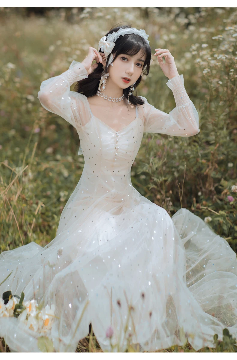 flowersverse Back to school Romantic Mesh Lace Fairy Dress Women Vintage Star Sequins Lantern Sleeve Soft Elegant Lady Midi Dresses Vestido Festa Ropa Mujer