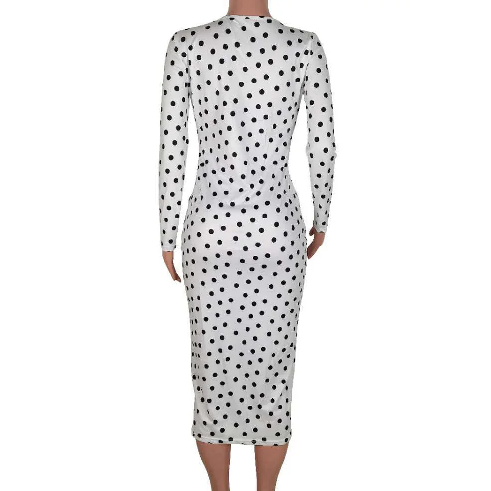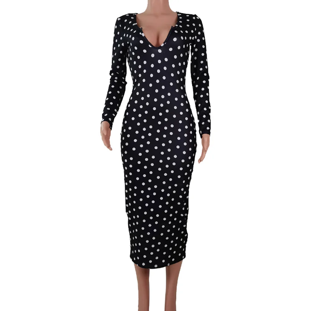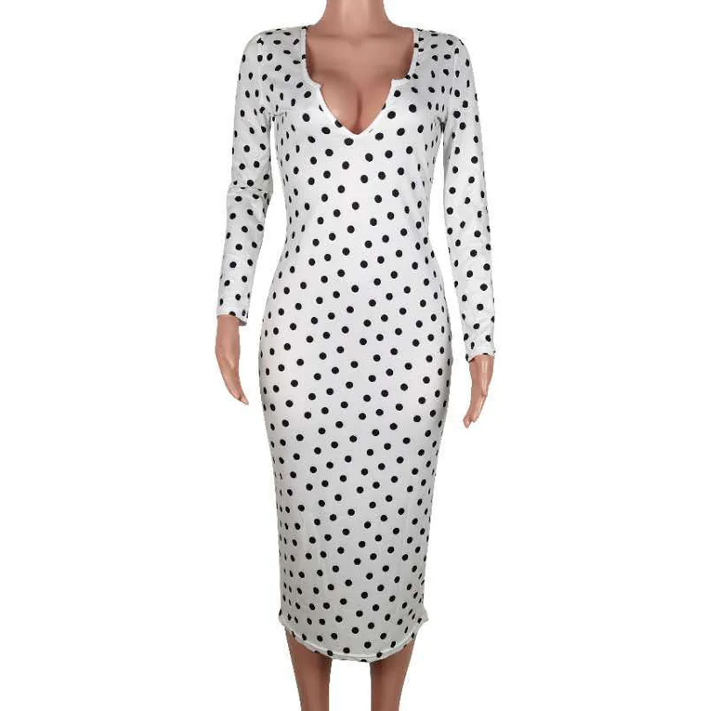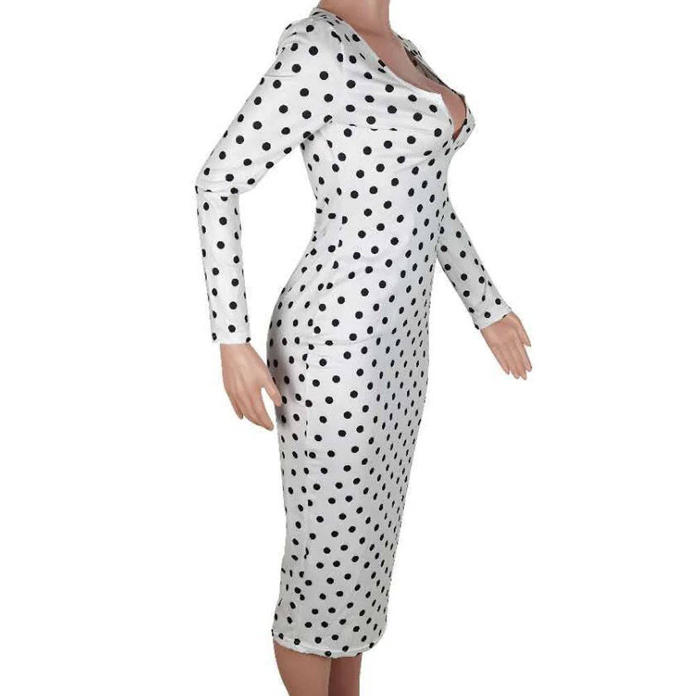 flowersverse Deep V Low Cut Bodycon Dress Vintage Leisure Women Polka Dot Dresses Office Lady Long Sleeve Bodycon Dress