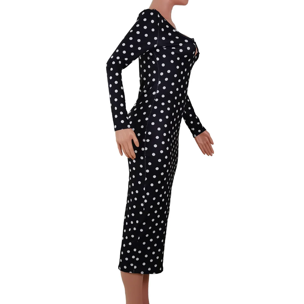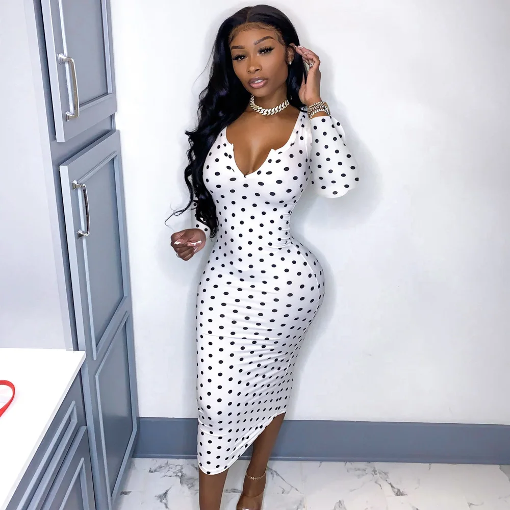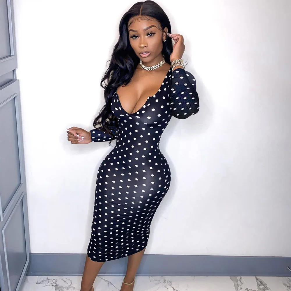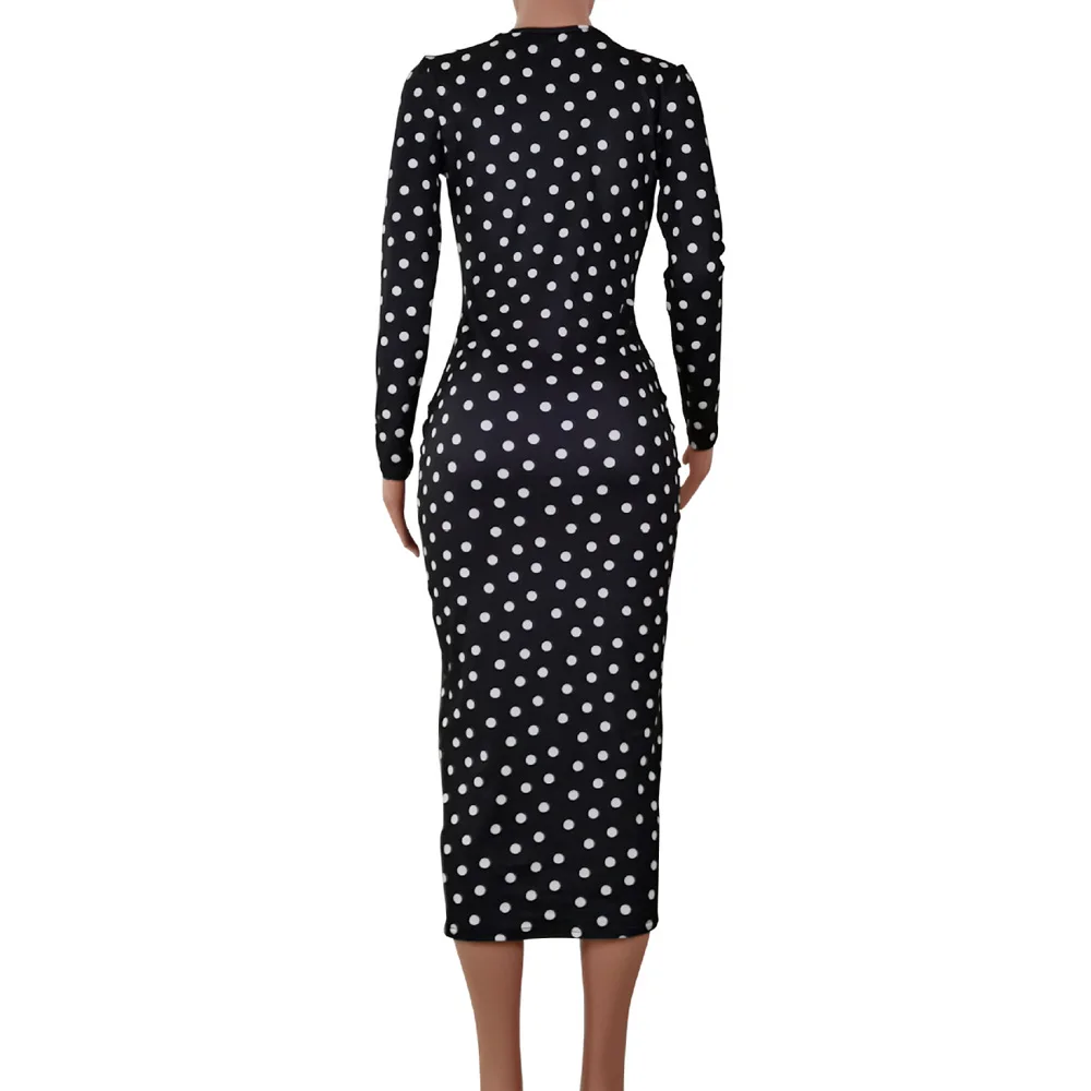 flowersverse Deep V Low Cut Bodycon Dress Vintage Leisure Women Polka Dot Dresses Office Lady Long Sleeve Bodycon Dress