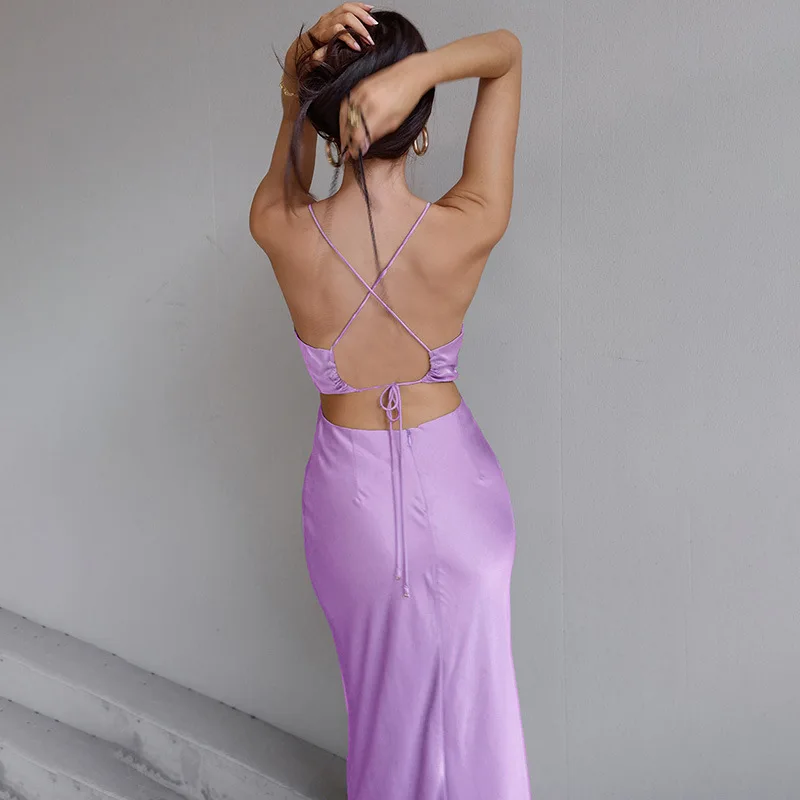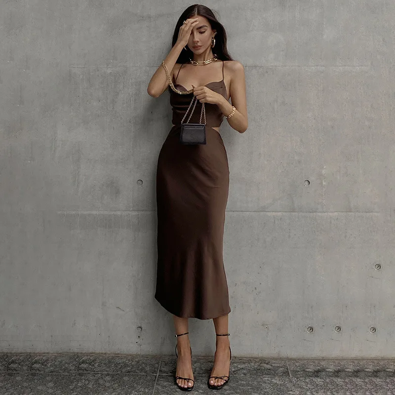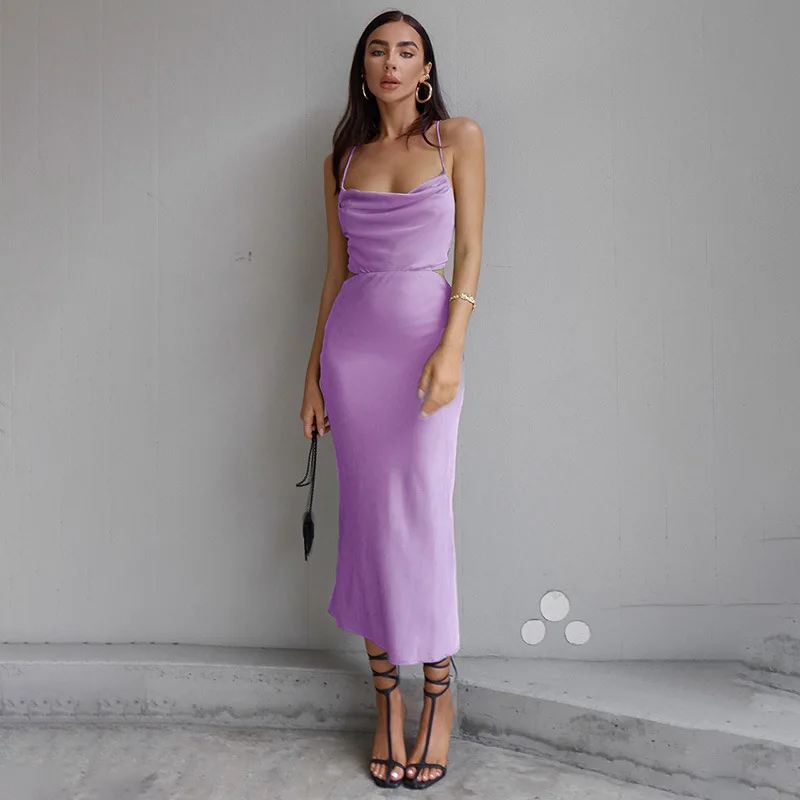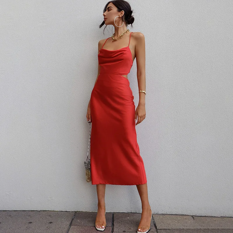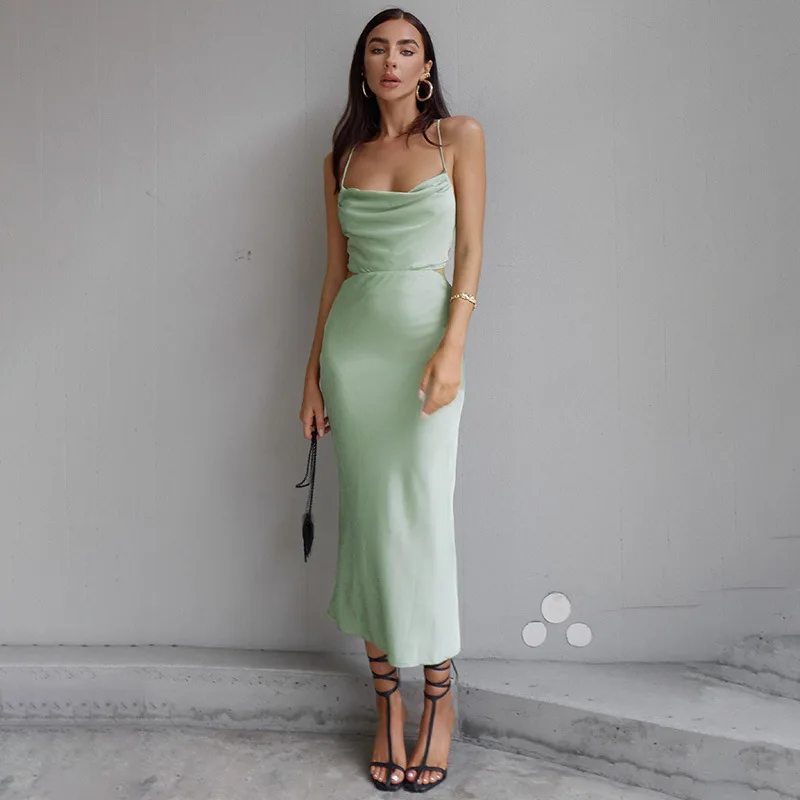 Satin Midi Dresses for Women Elegant Ruched Party Evening Bodycon Slip Long Dress Summer Spaghetti Strap Club Outfits