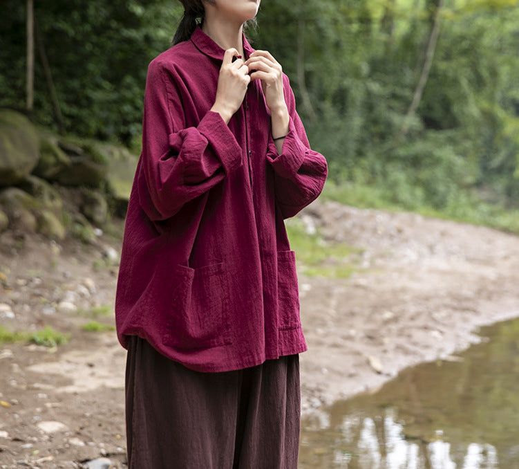Shan Qian Nianyi 2021 Spring and Autumn Cotton and Linen Long Sleeve Cardigan Shirt Lapel Solid Color Linen Women's Peter Pan Collar Shirt