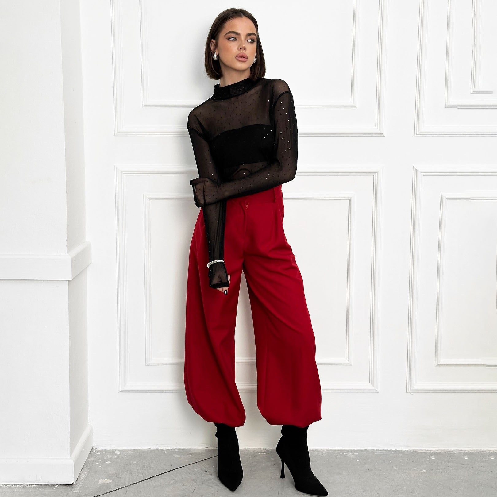 spring and summer new high-end hot diamond mesh see-through long-sleeved T-shirt wearing Spice Girl fashion design top