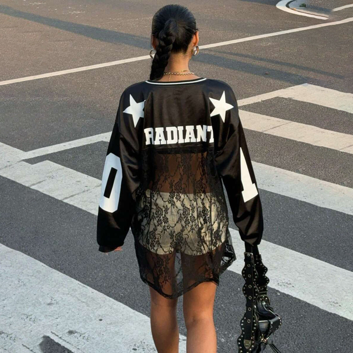 Street style Spice Girl fashion lace splicing contrasting color collar pullover sweater women's loose perspective design sense printed top