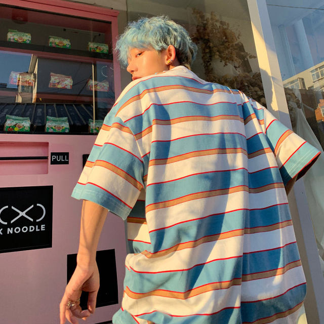 flowersverse Striped Contrast Short Sleeve T-Shirt Men's Trendy Summer Street Hip Hop Loose Retro Couple Tops Personality Cotton Half Sleeve