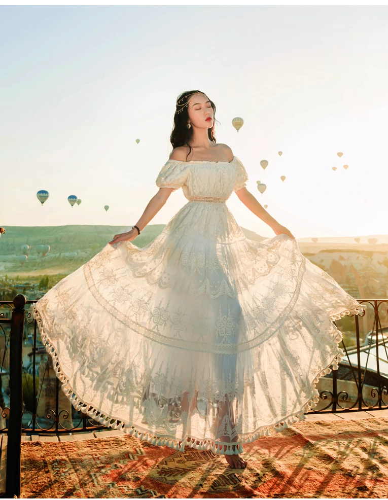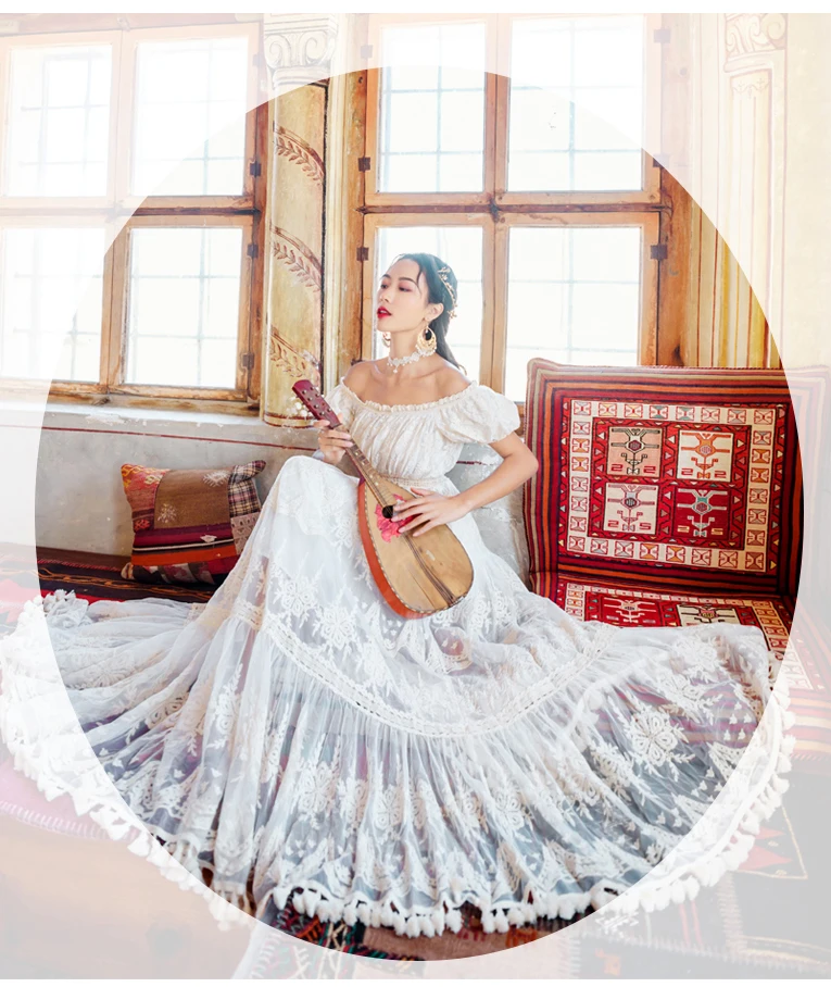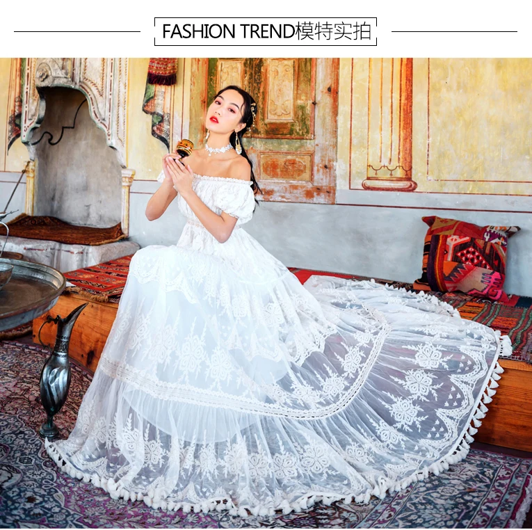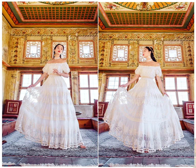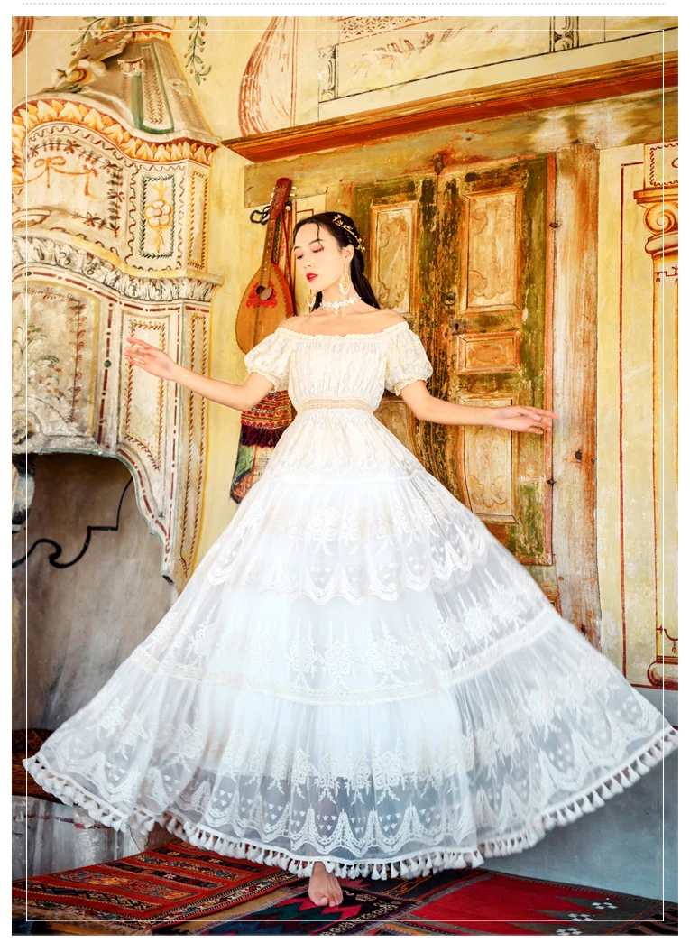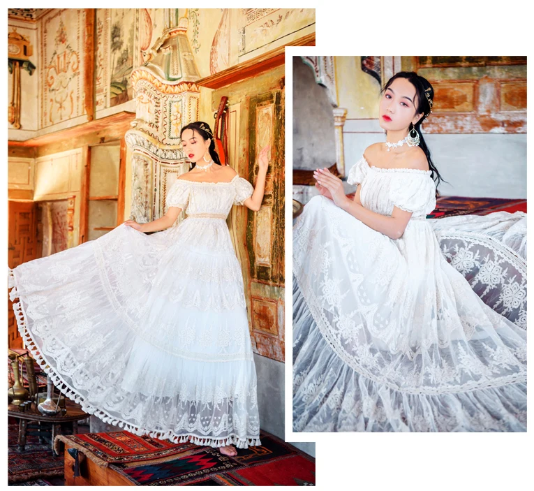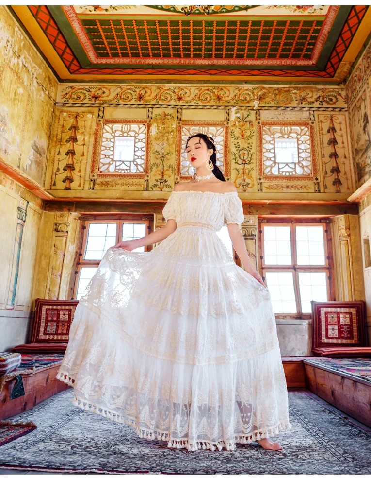 flowersverse Back to school outfit Summer Lace Fairy Dress Vintage Slash Neck Off Shoulder Tassel Floor Length Princess Dresses For Holiday Evening Party Night