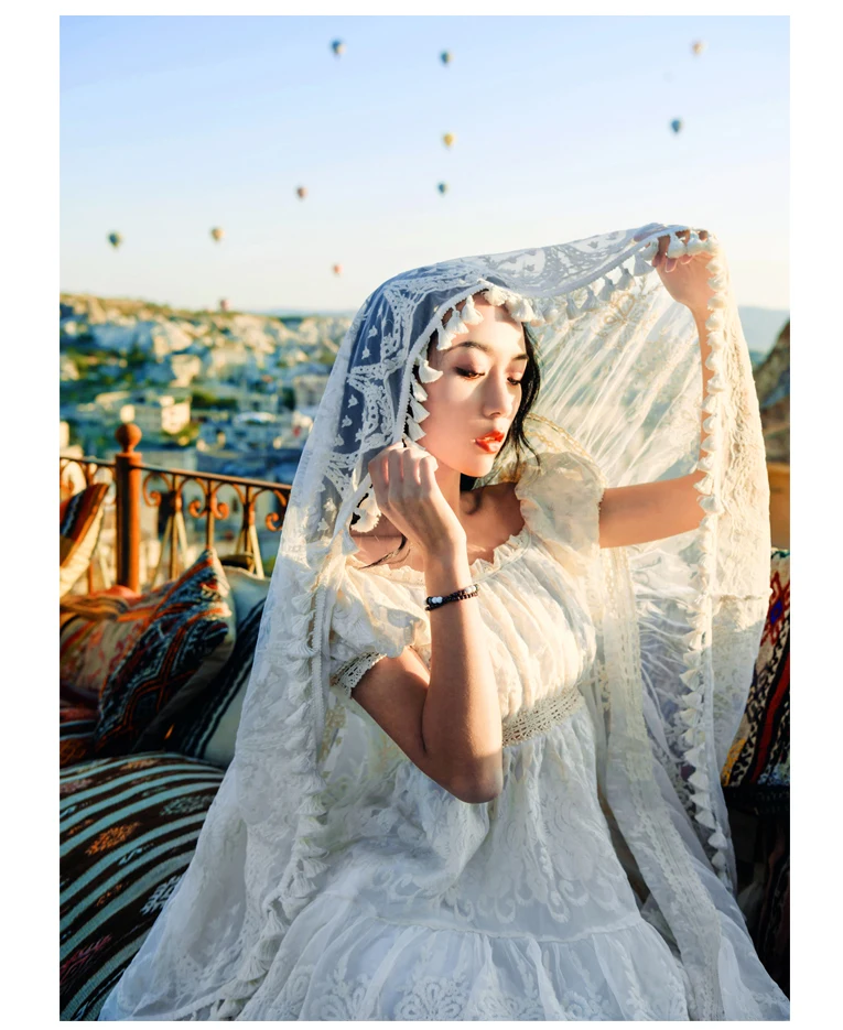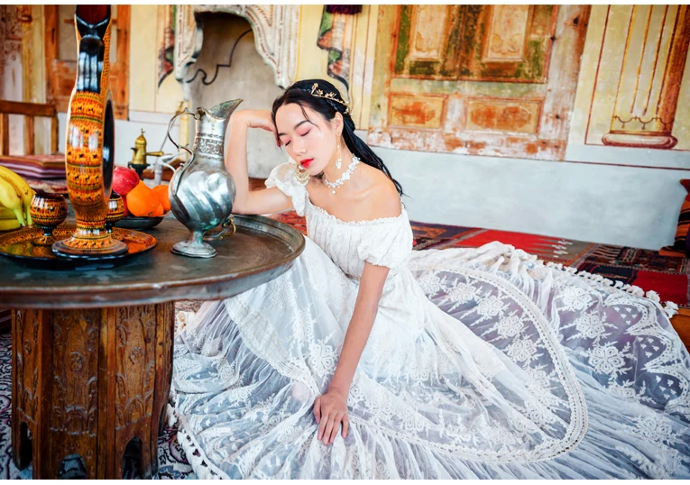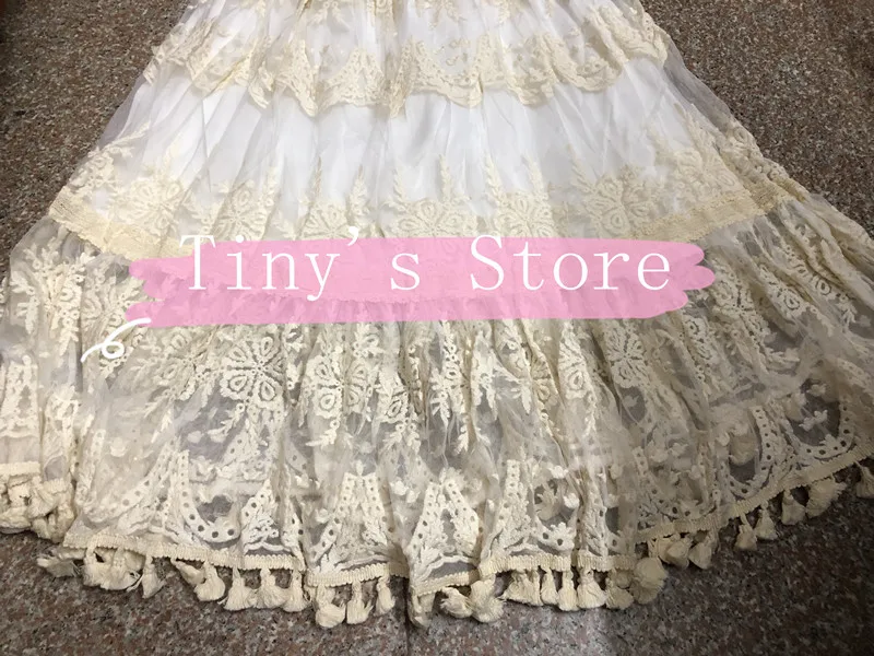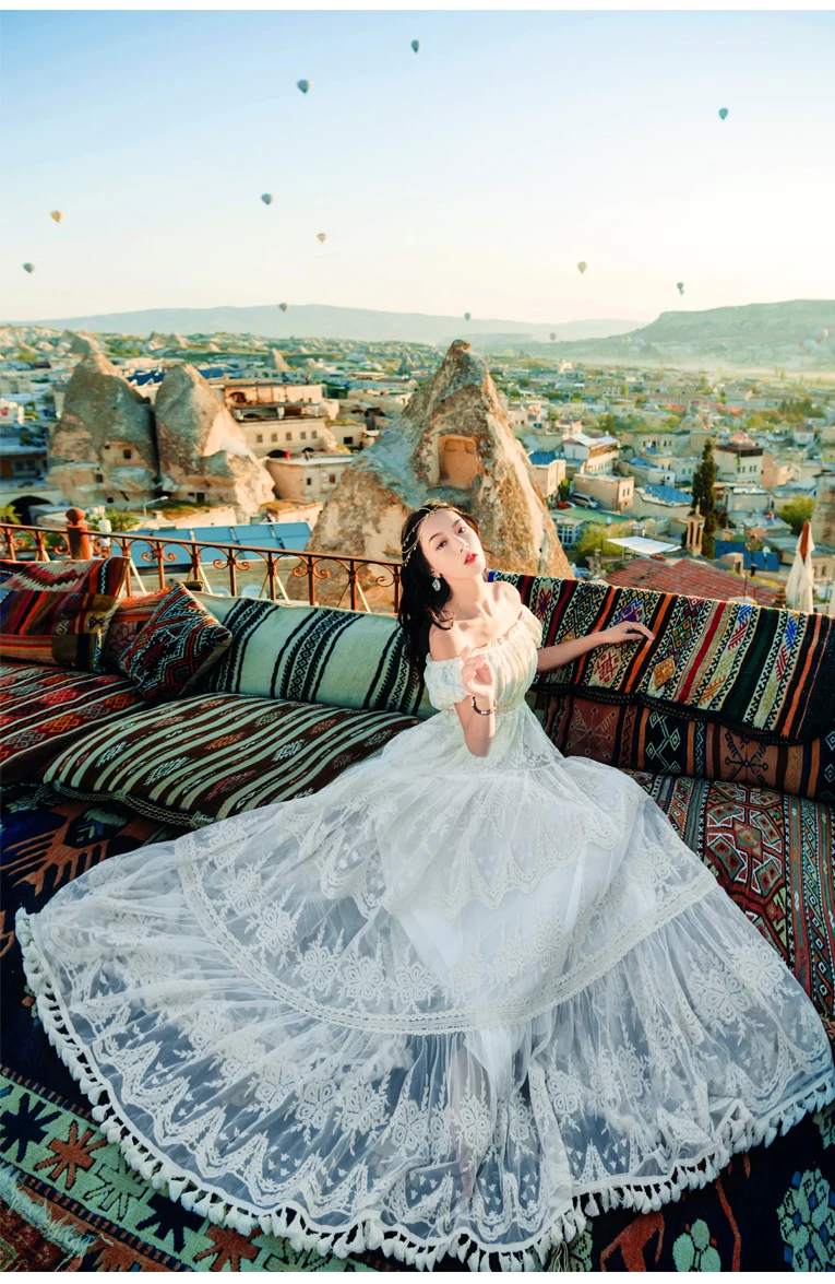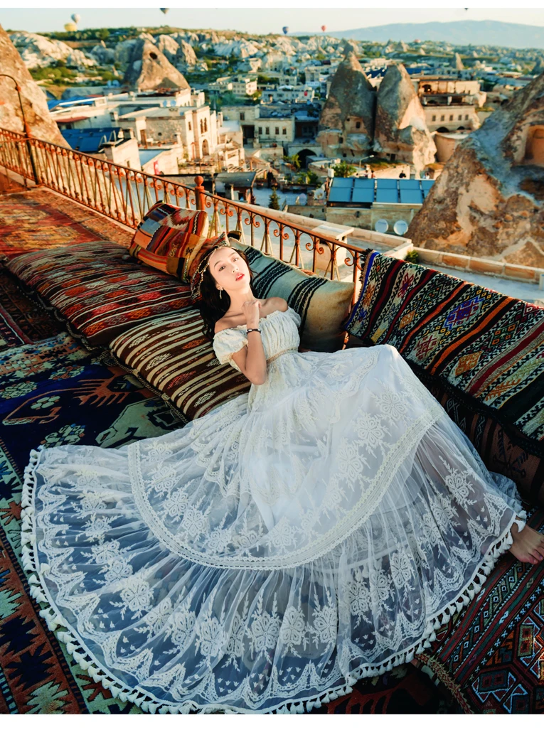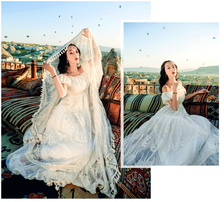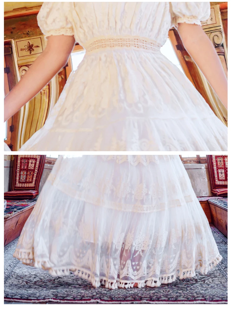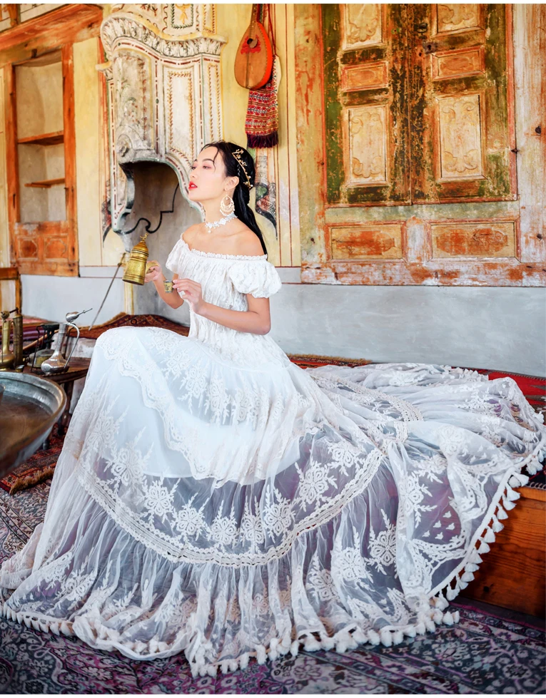 flowersverse Back to school outfit Summer Lace Fairy Dress Vintage Slash Neck Off Shoulder Tassel Floor Length Princess Dresses For Holiday Evening Party Night