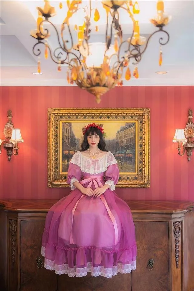 flowersverse Back to school outfit Summer Retro Lolita Princess Dress Woman Vintage Violet Organza Lace Slash Neck Puff Sleeve Gorgeous Royal Long Dresses Vestido