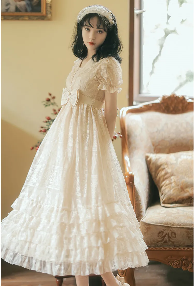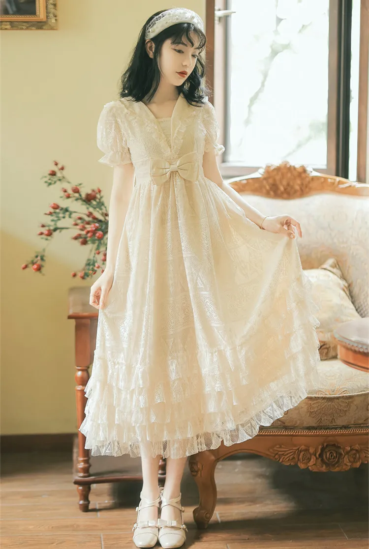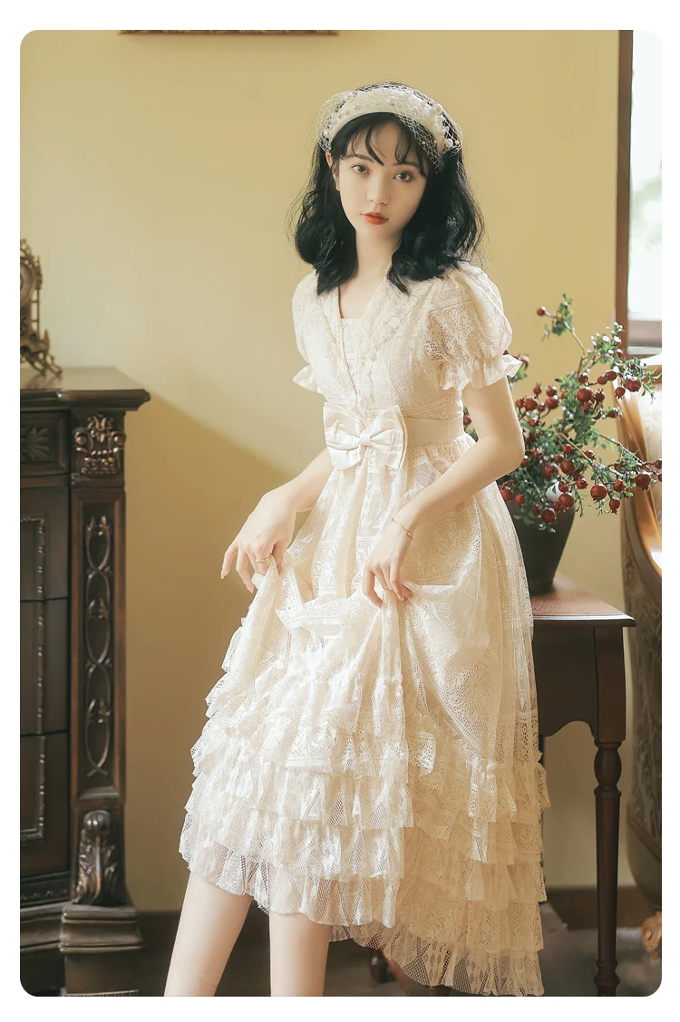 flowersverse Back to school outfit Sweet Lace Fairy Dress Women Retro Bow V-Neck Princess Dresses For Slim Lady Lolita Ball Gown Vintage Mori Girl Vestidos Largos