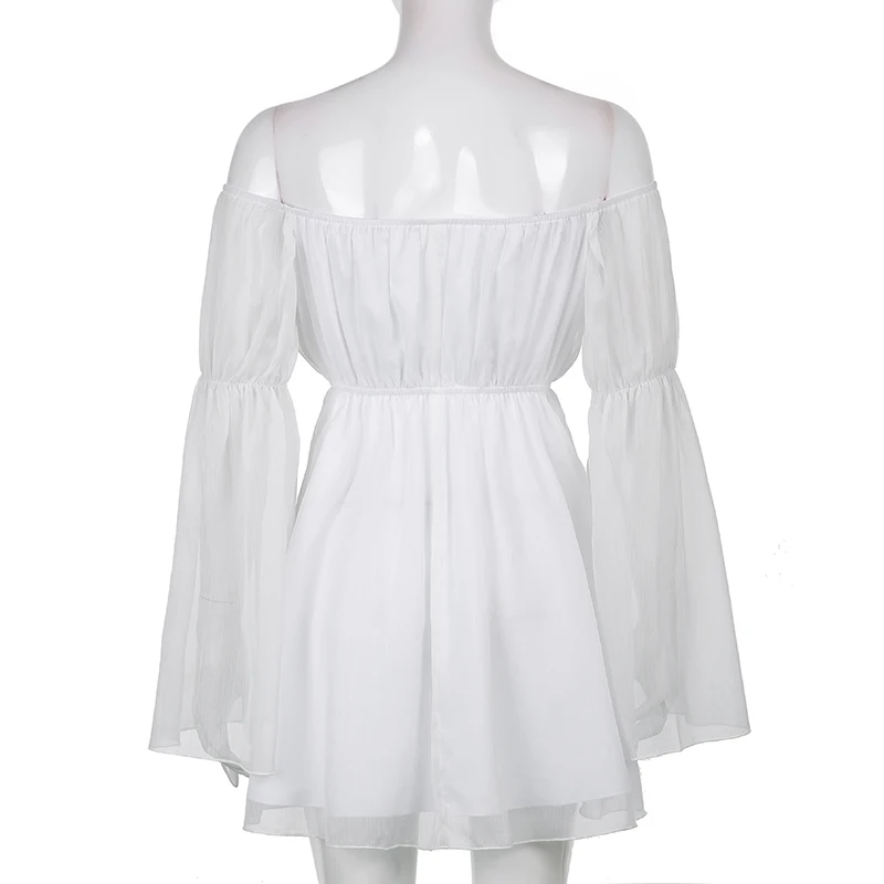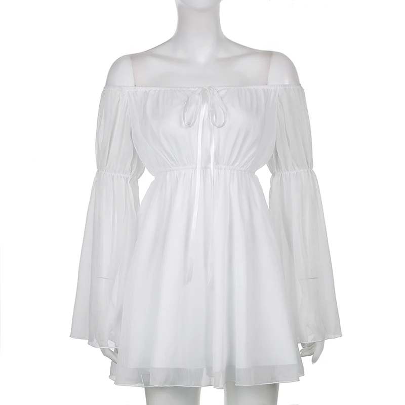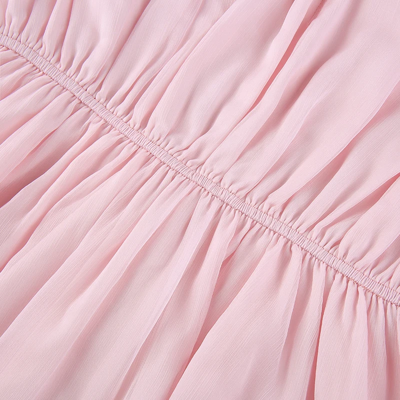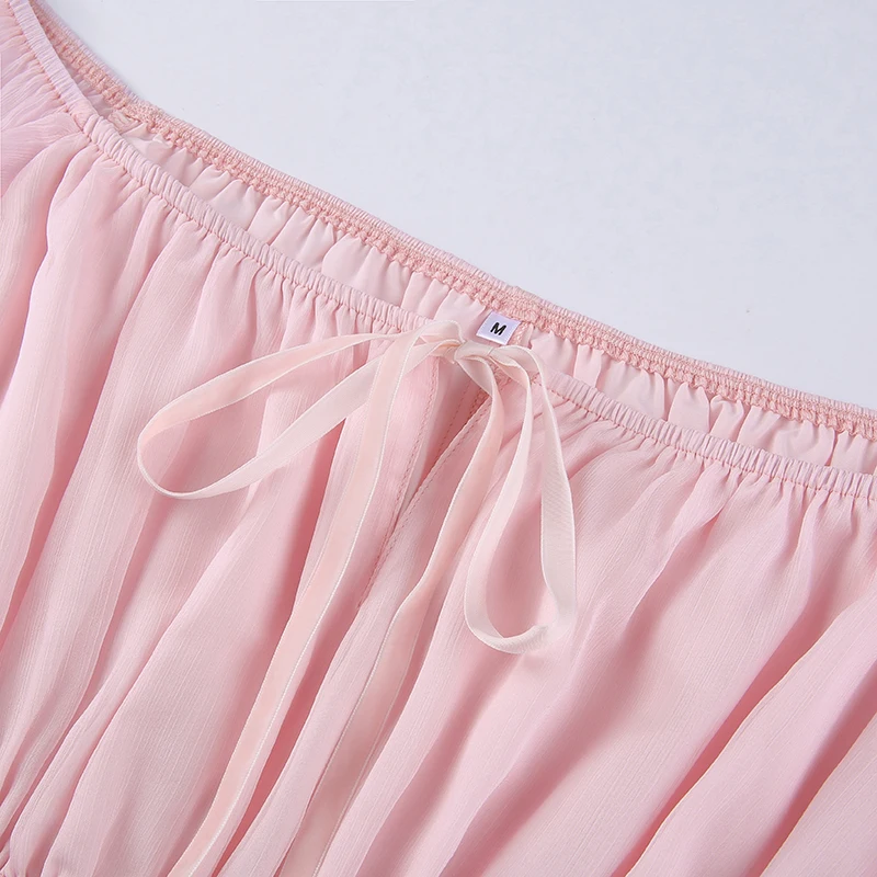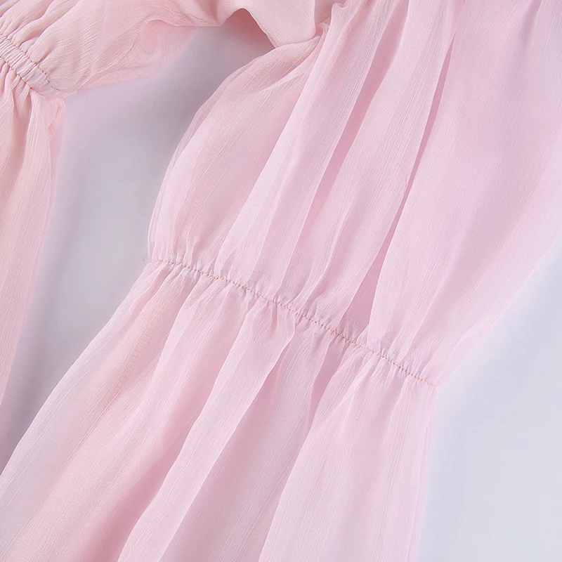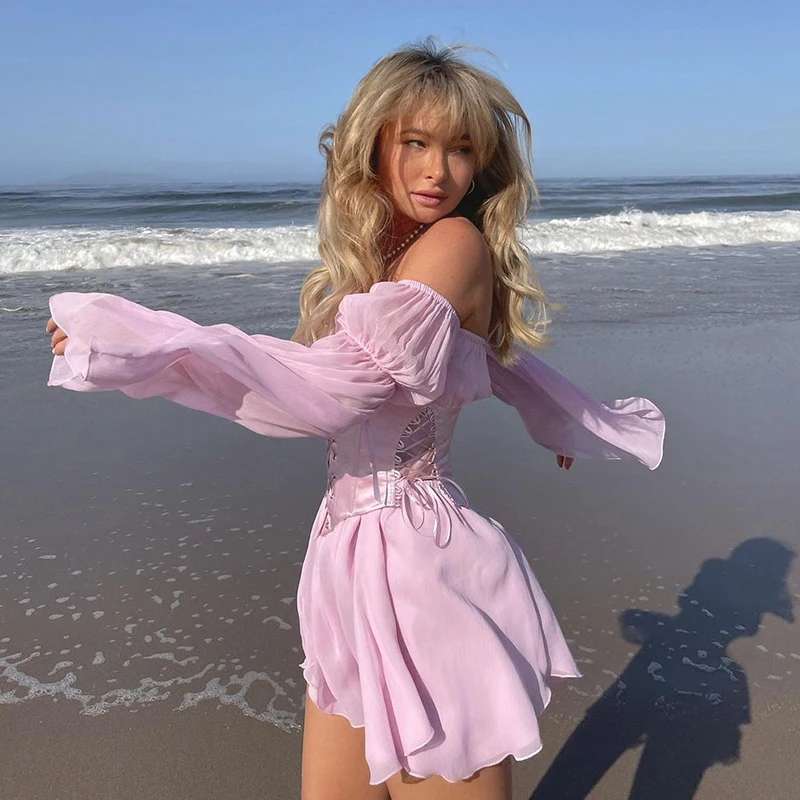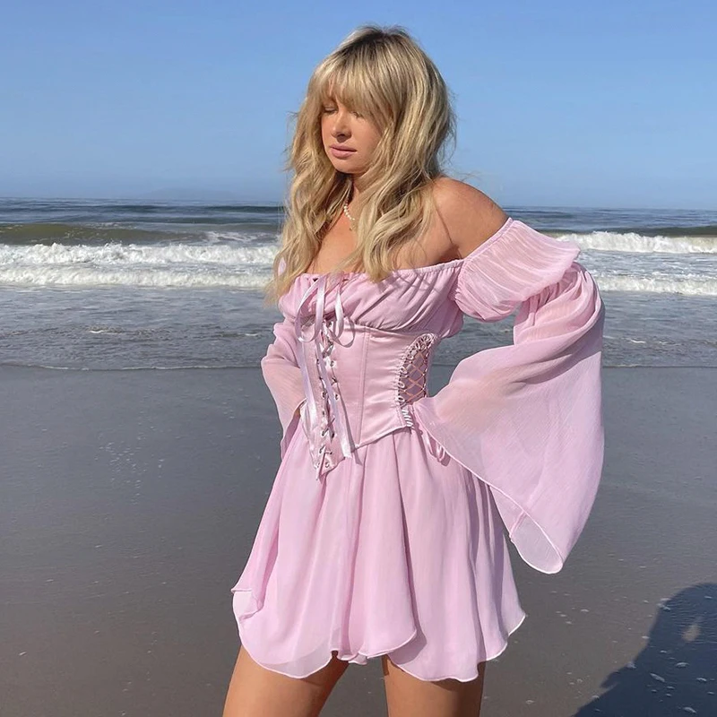Sweetown Pink Chiffon Corset Dresses Women French Style Long Sleeve Boho Dress Ladies Slash Neck Elegant Beach Dress Robe Femme
