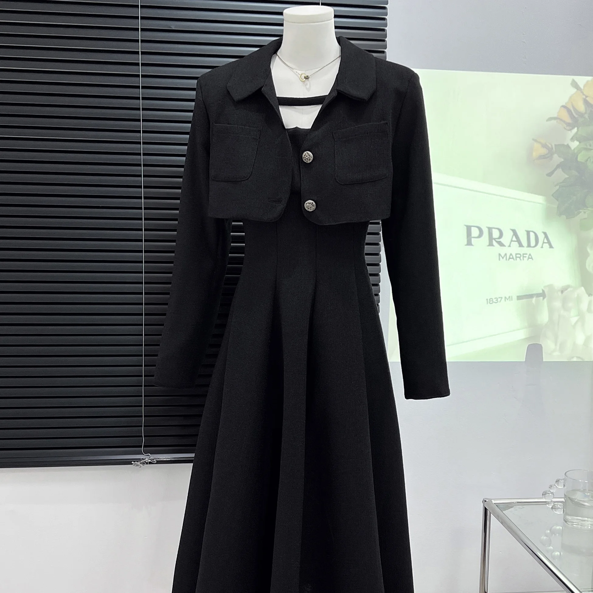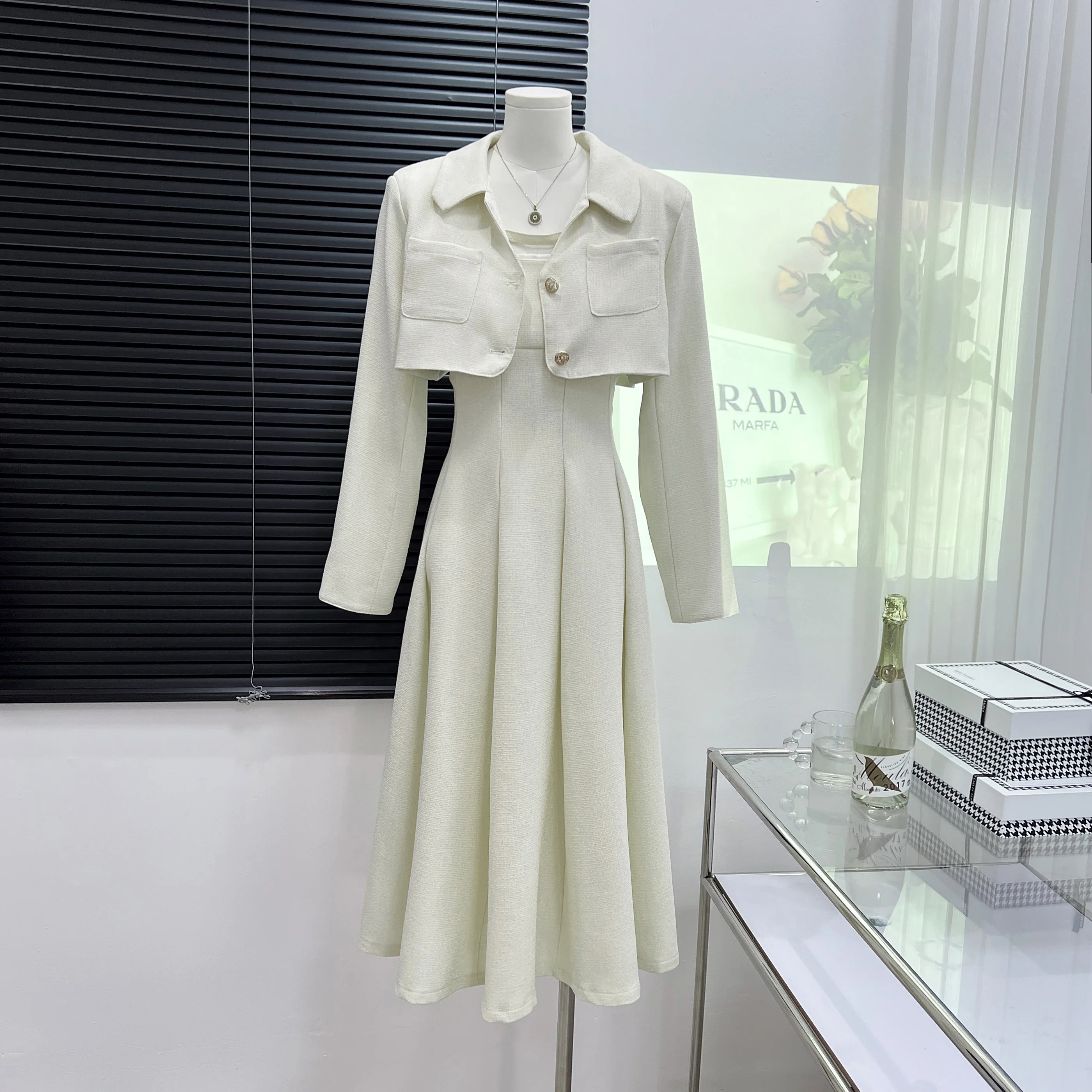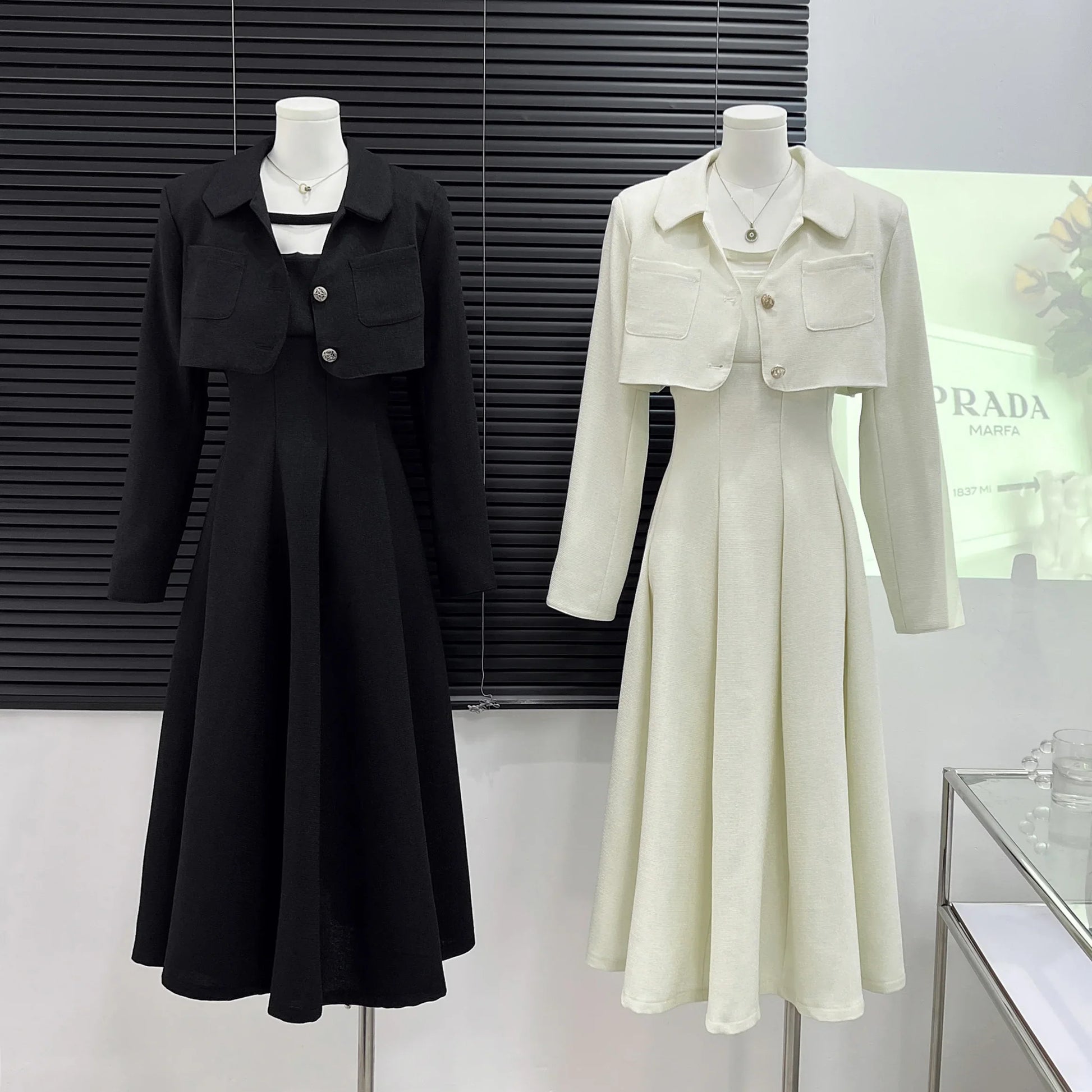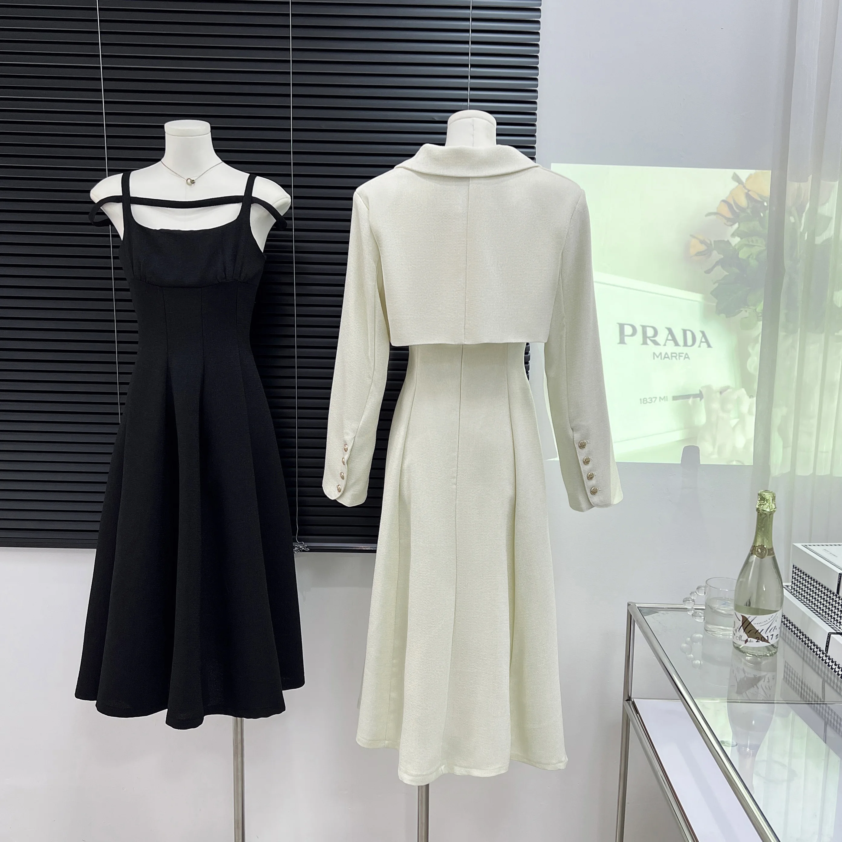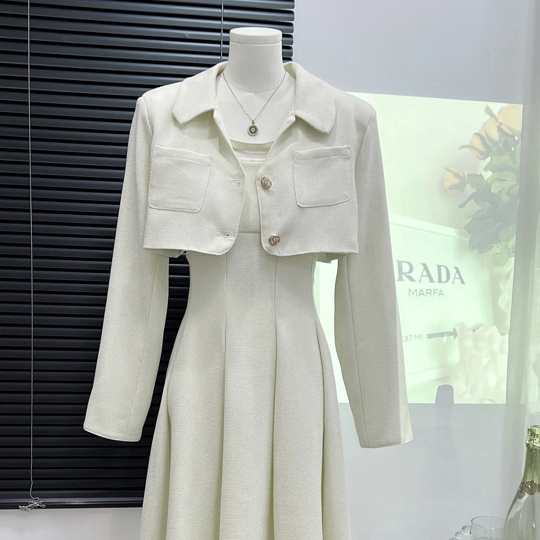 flowersverse Vintage College Style Cropped Blazer Two Piece Dress Sets Women's Short Jacket Coat +Strapless Sling Slim Mid Dress Suits Female