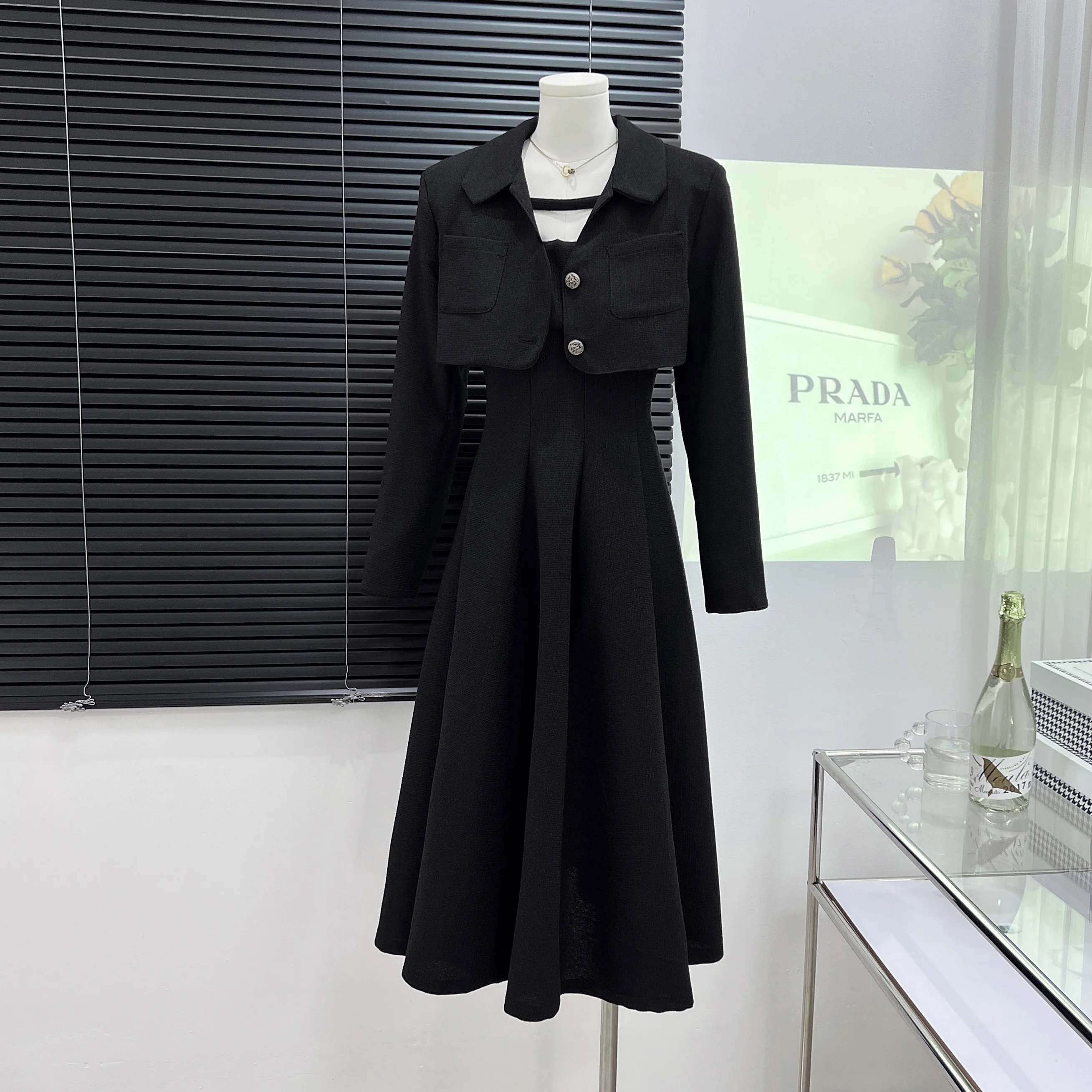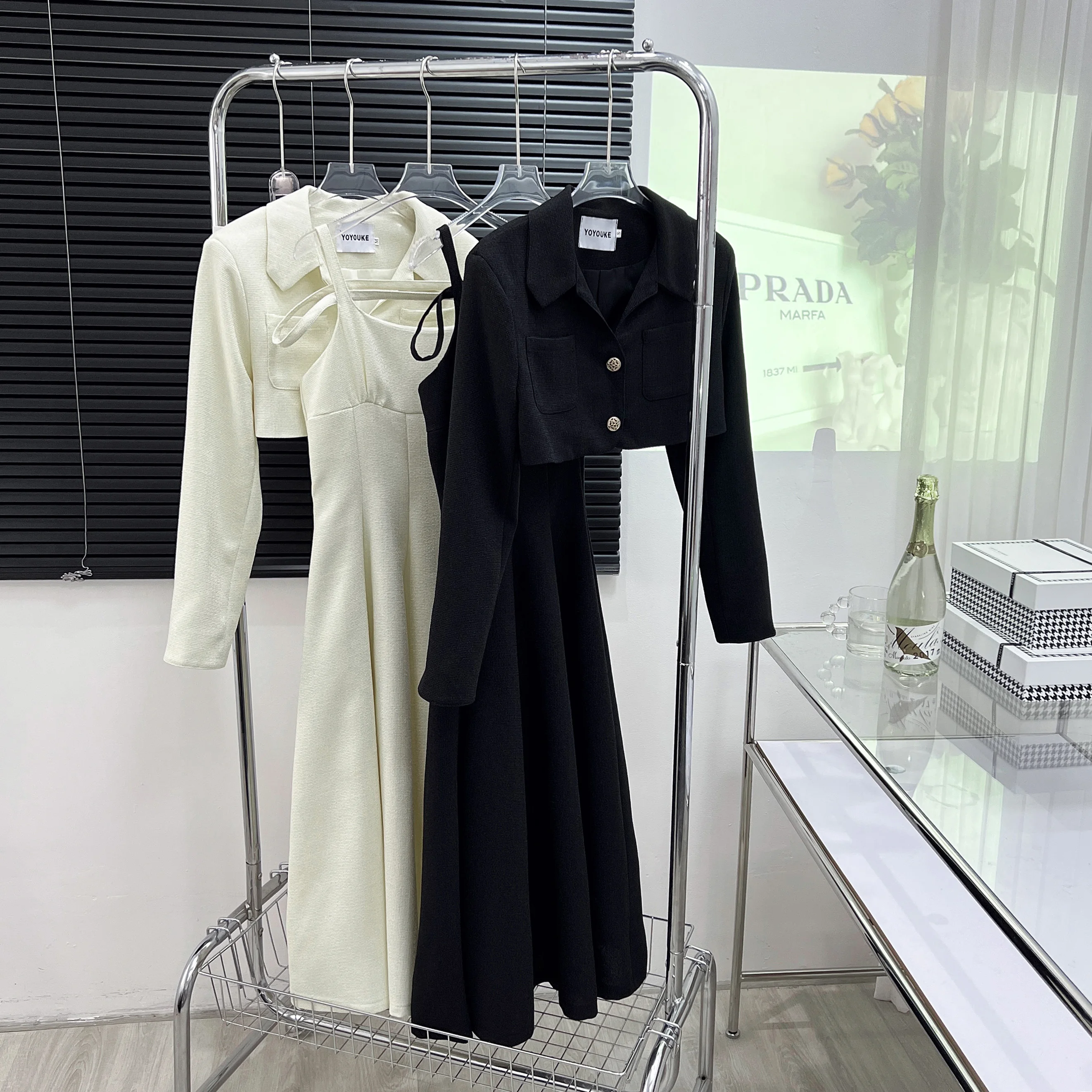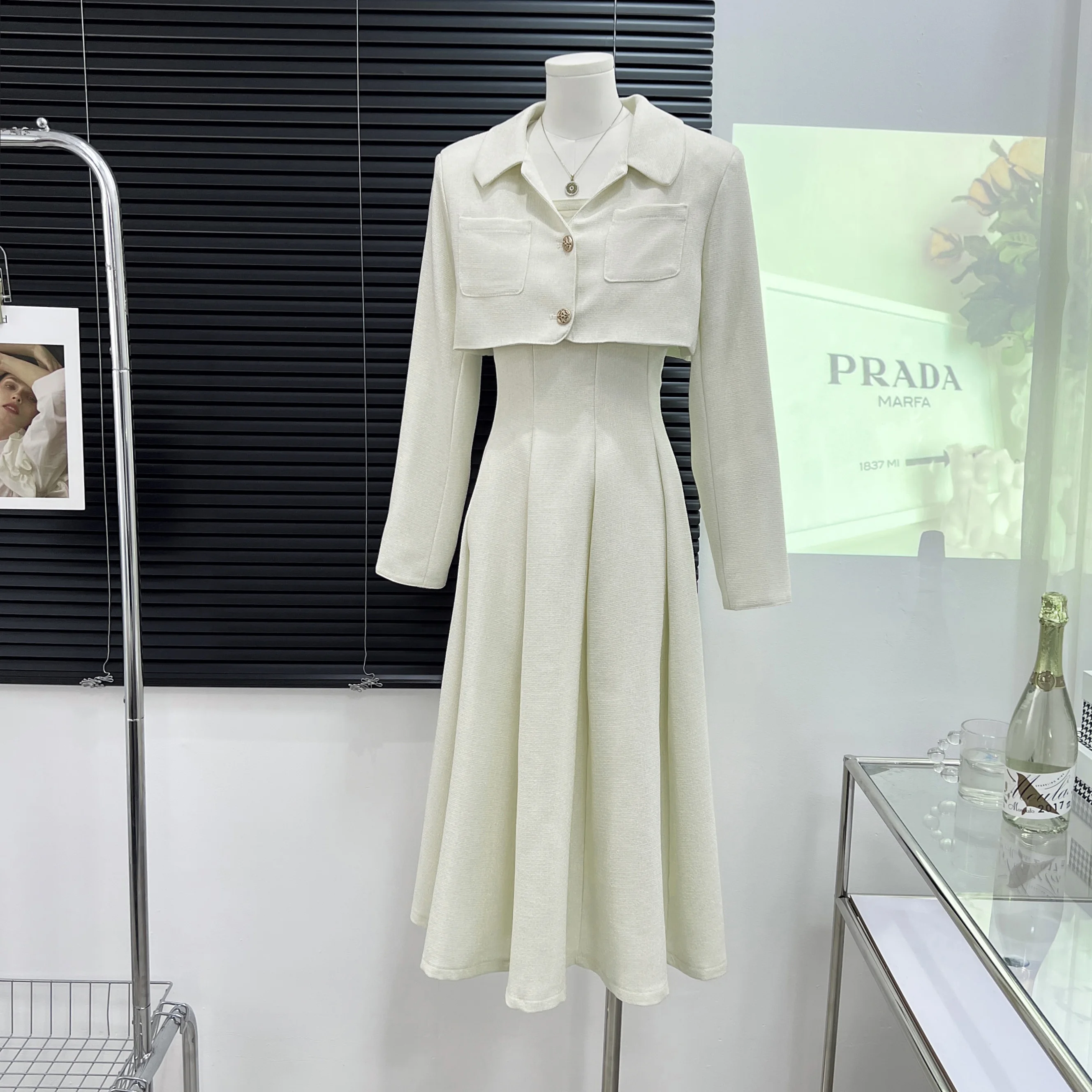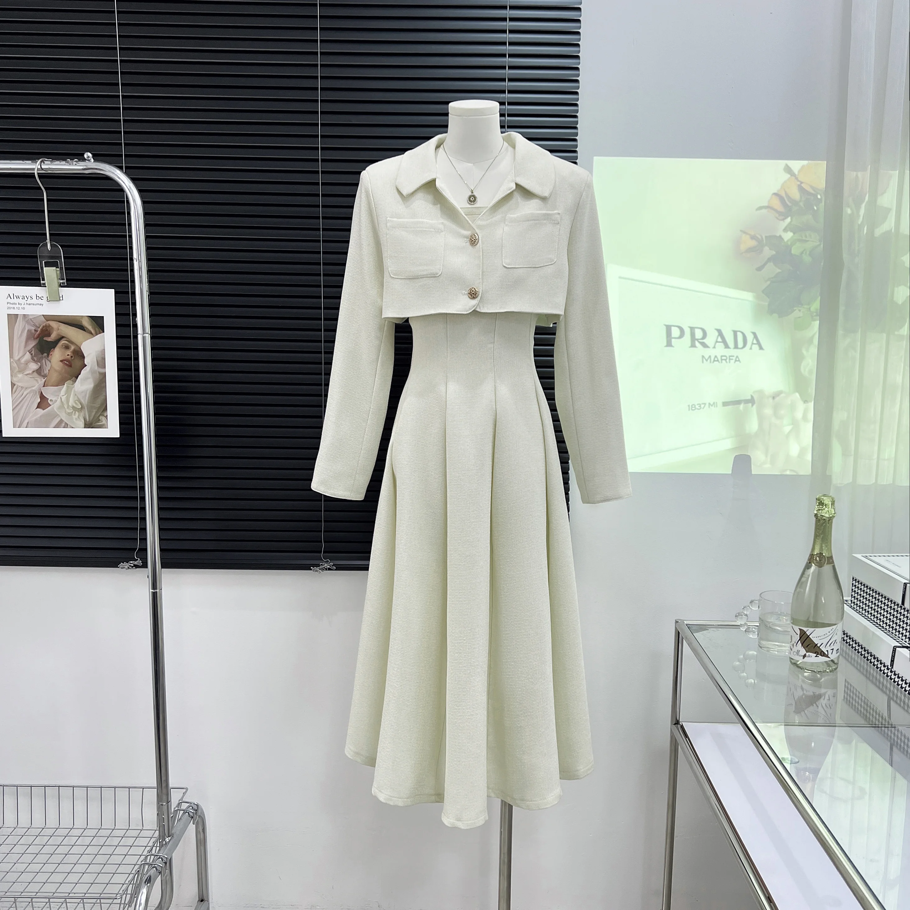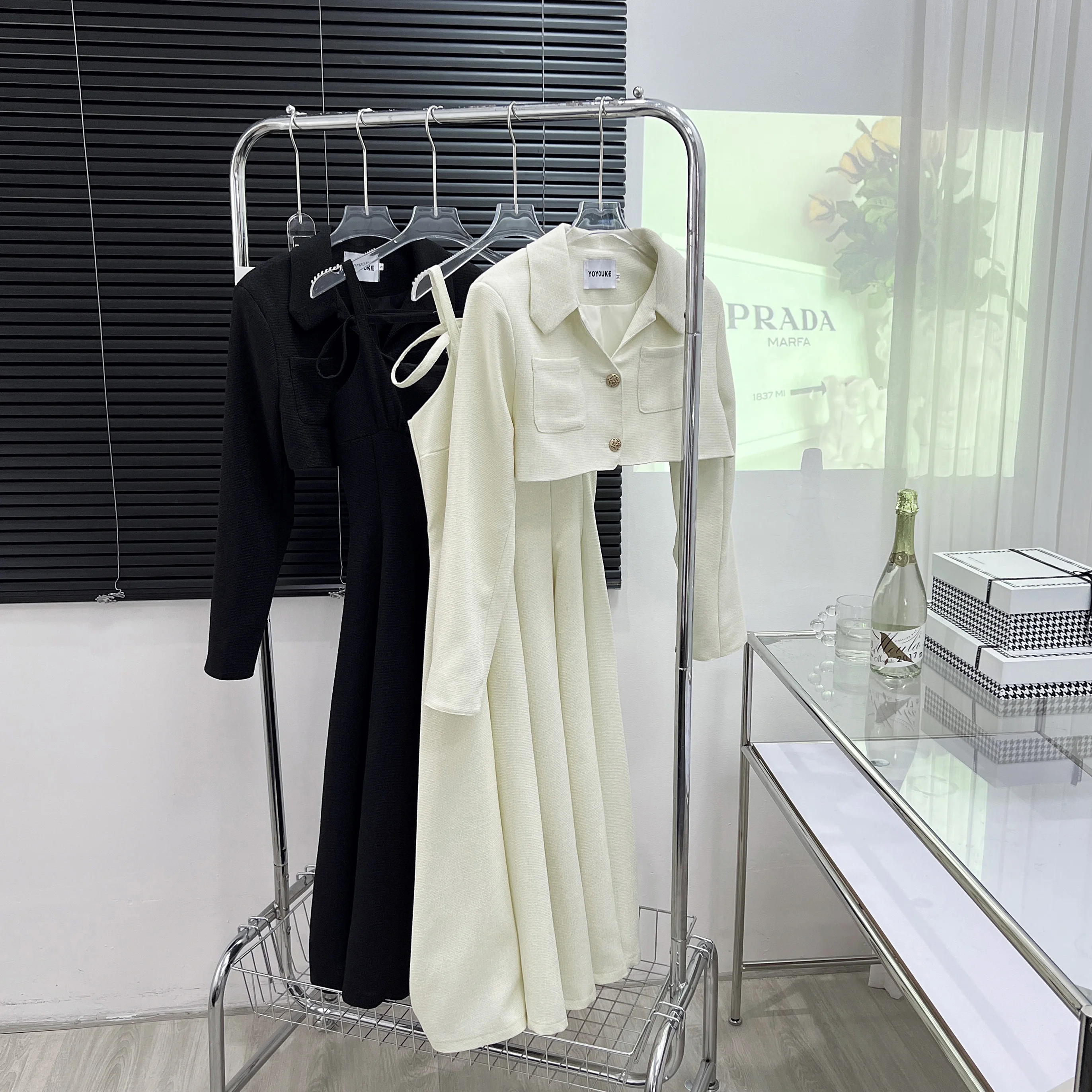 flowersverse Vintage College Style Cropped Blazer Two Piece Dress Sets Women's Short Jacket Coat +Strapless Sling Slim Mid Dress Suits Female