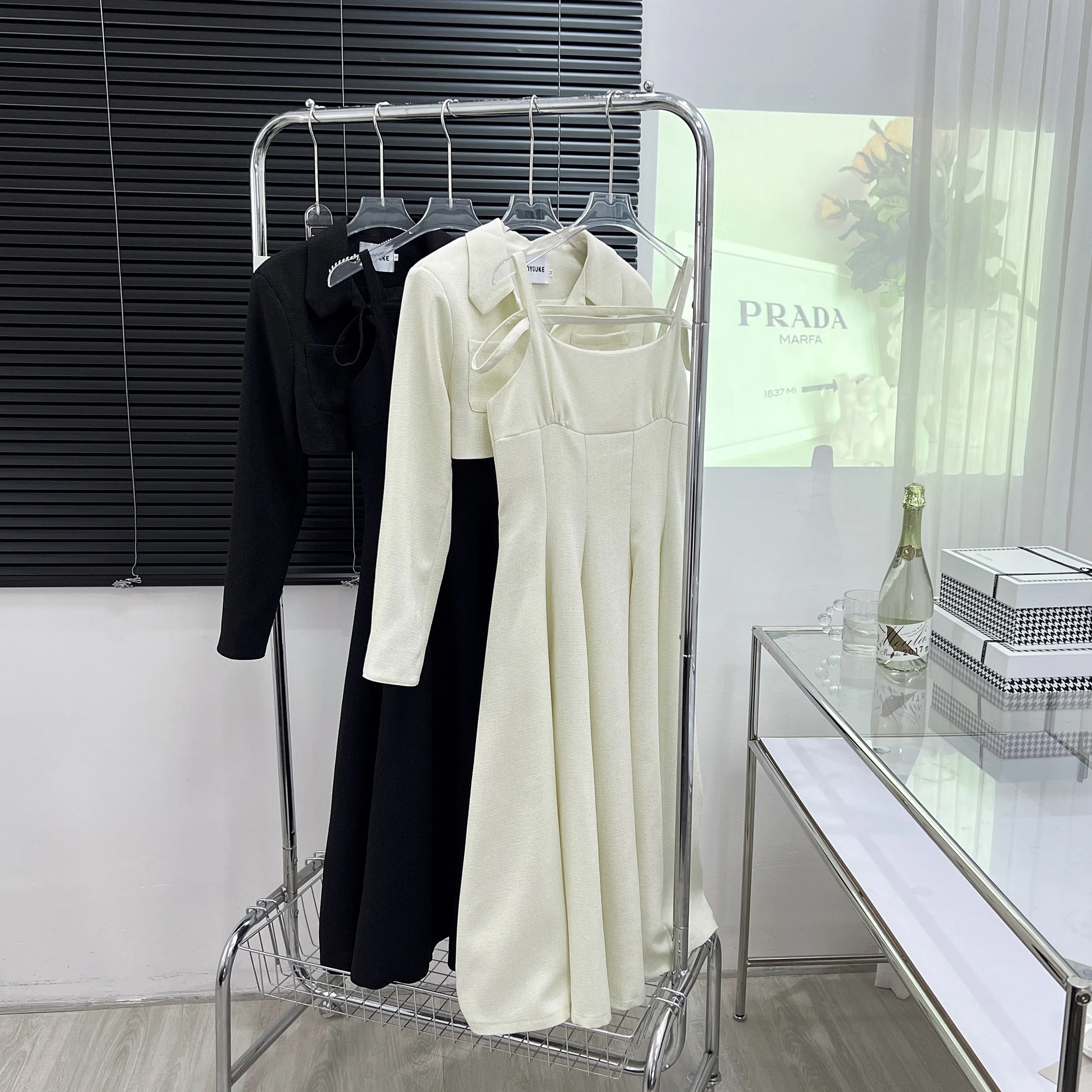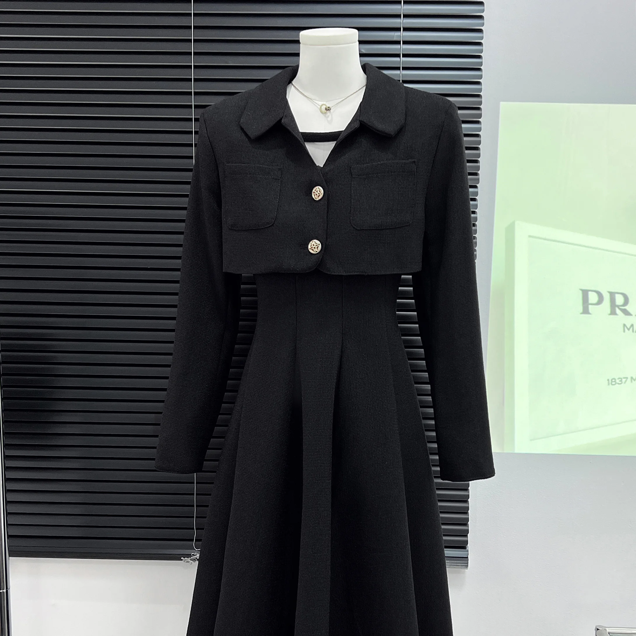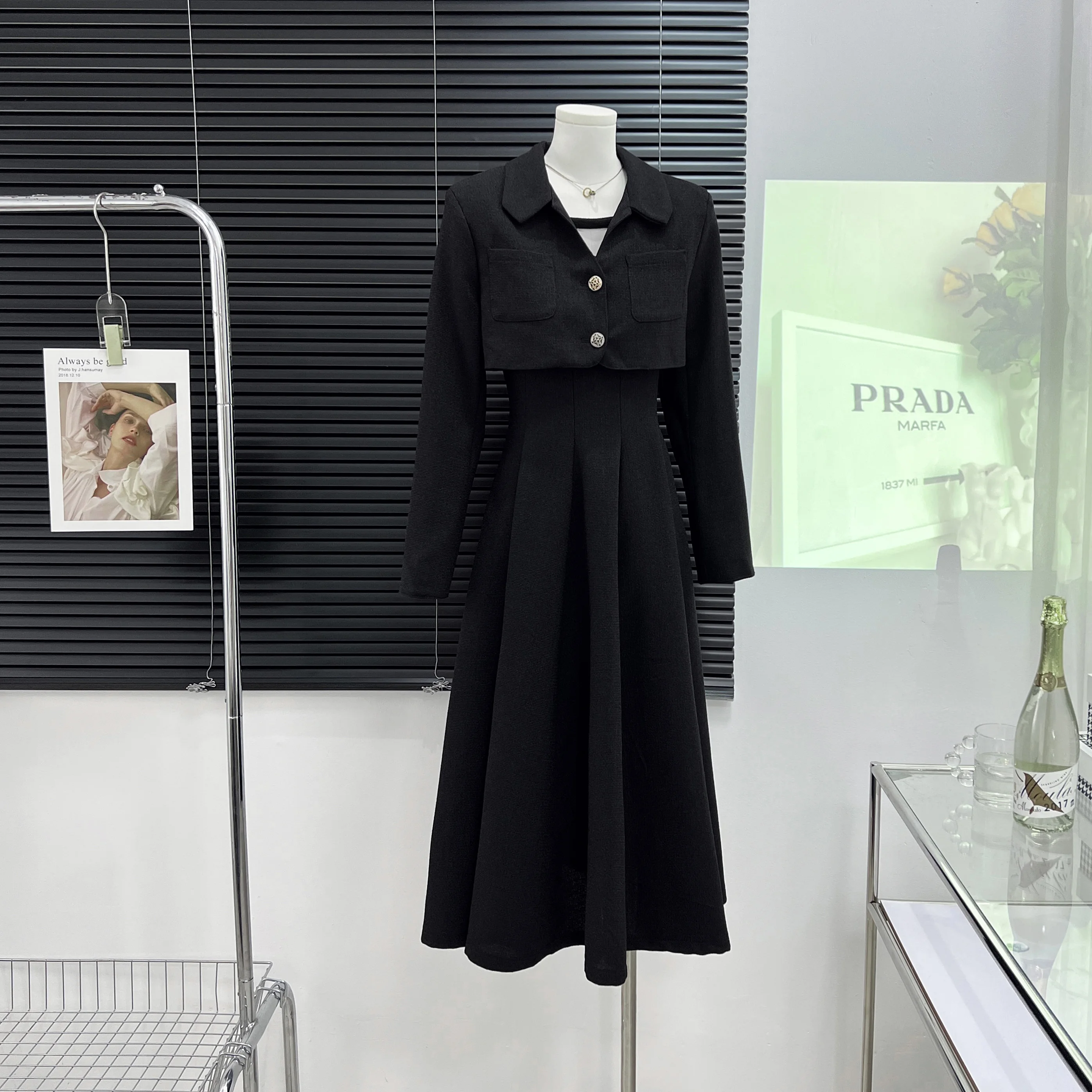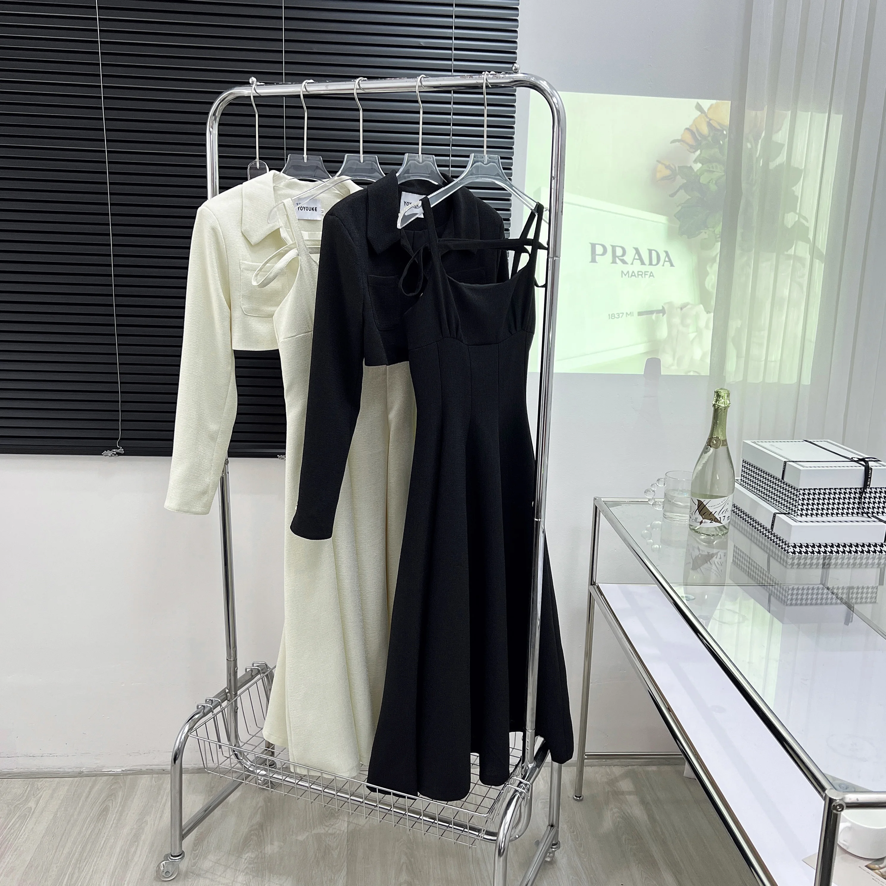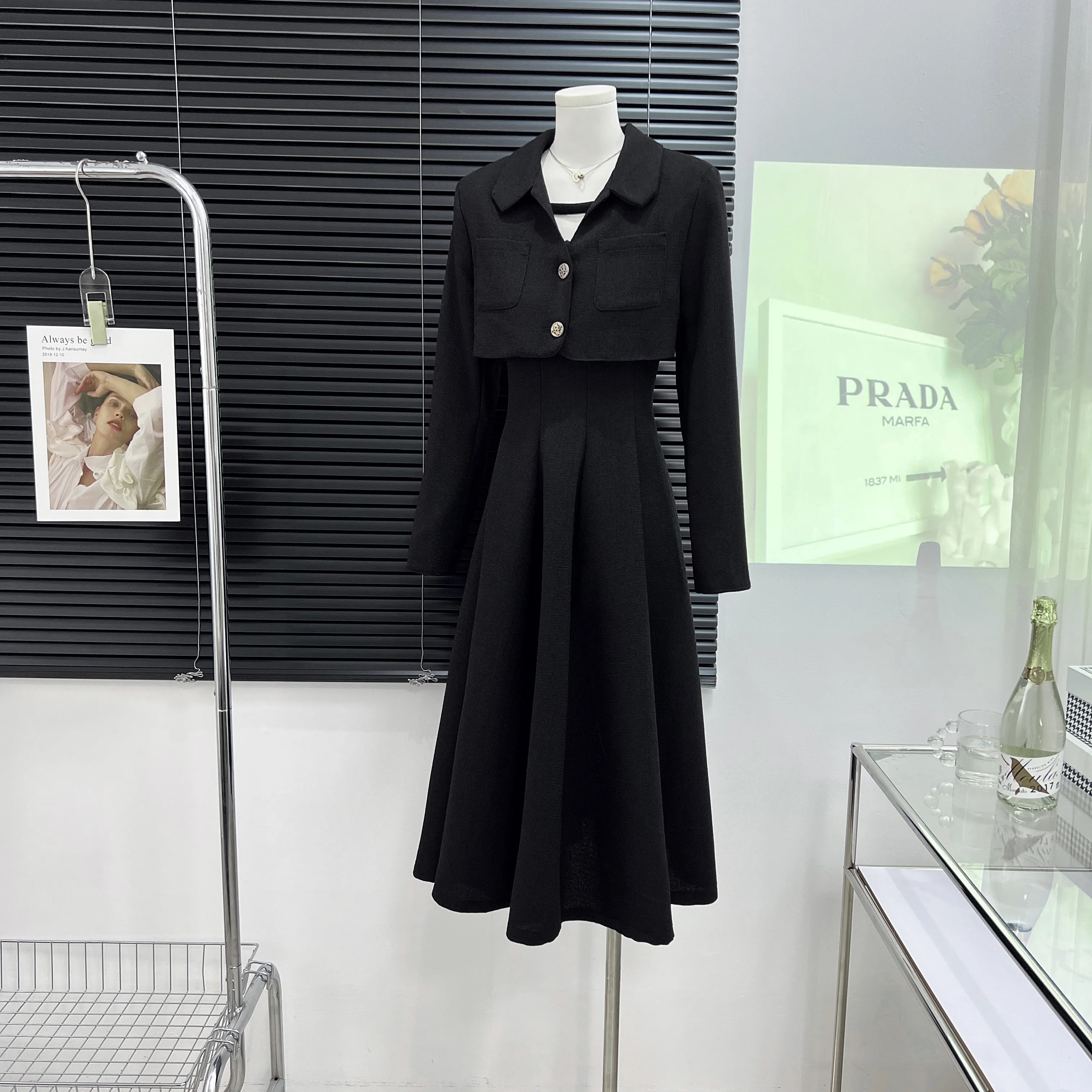 flowersverse Vintage College Style Cropped Blazer Two Piece Dress Sets Women's Short Jacket Coat +Strapless Sling Slim Mid Dress Suits Female