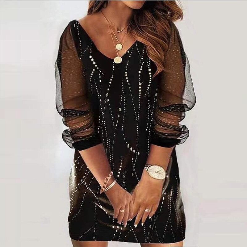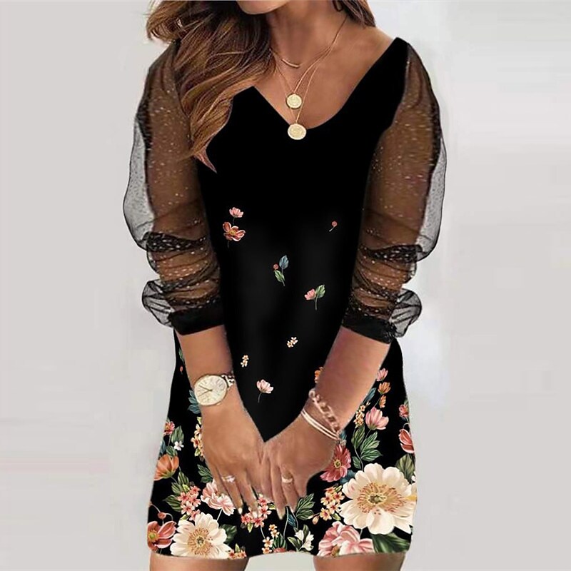 flowersverse Women's Plus Size Holiday Dress Floral V Neck Mesh Long Sleeve Fall Spring Casual Mini Dress Causal Daily Dress / Sheath Dress / Black Dress / Print