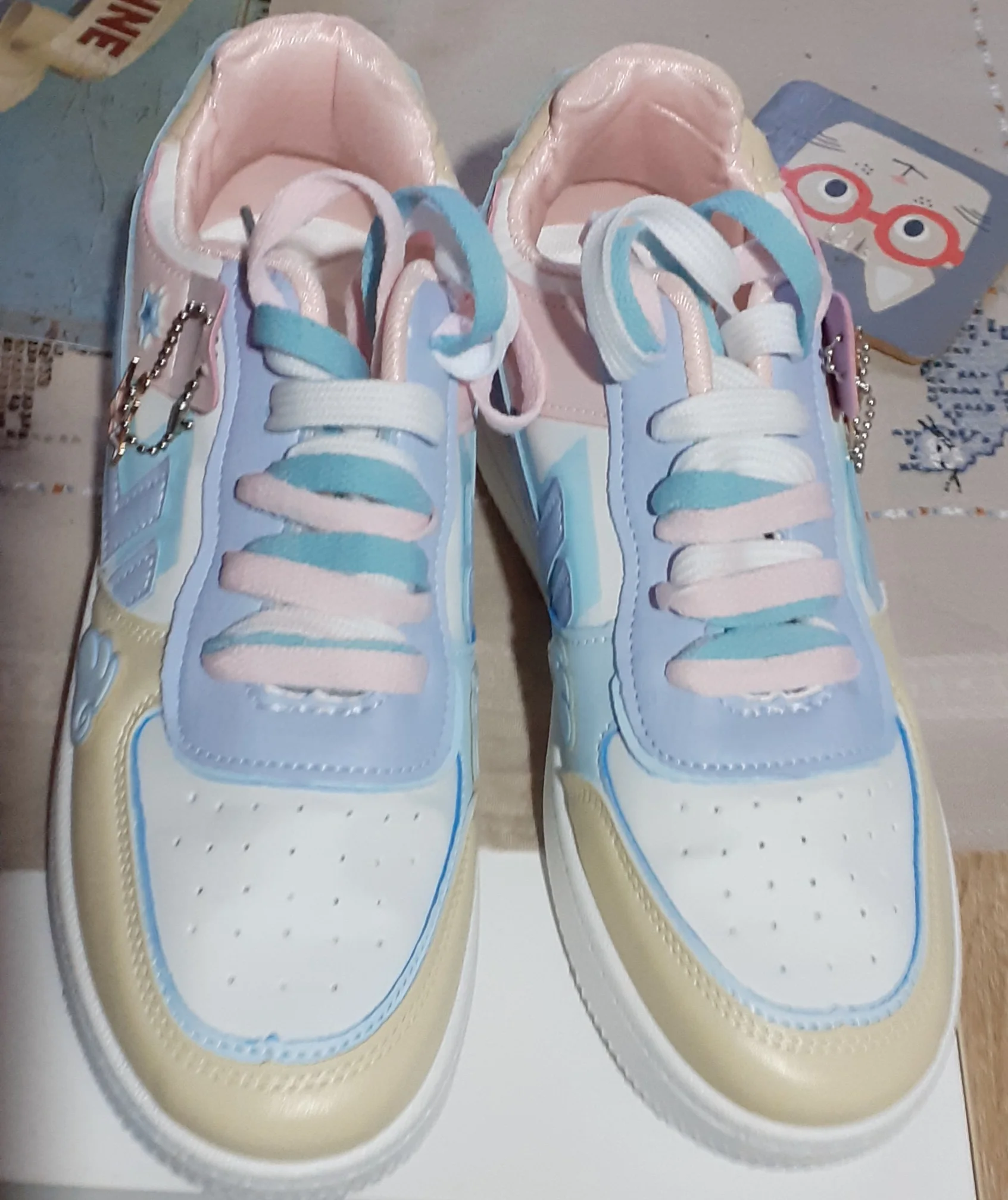 Precious, they arrived at the estimated date; There is a smell of acrylic paint but it is passable. Very comfortable and bring three pairs of different color laces, stickers and keychains. |